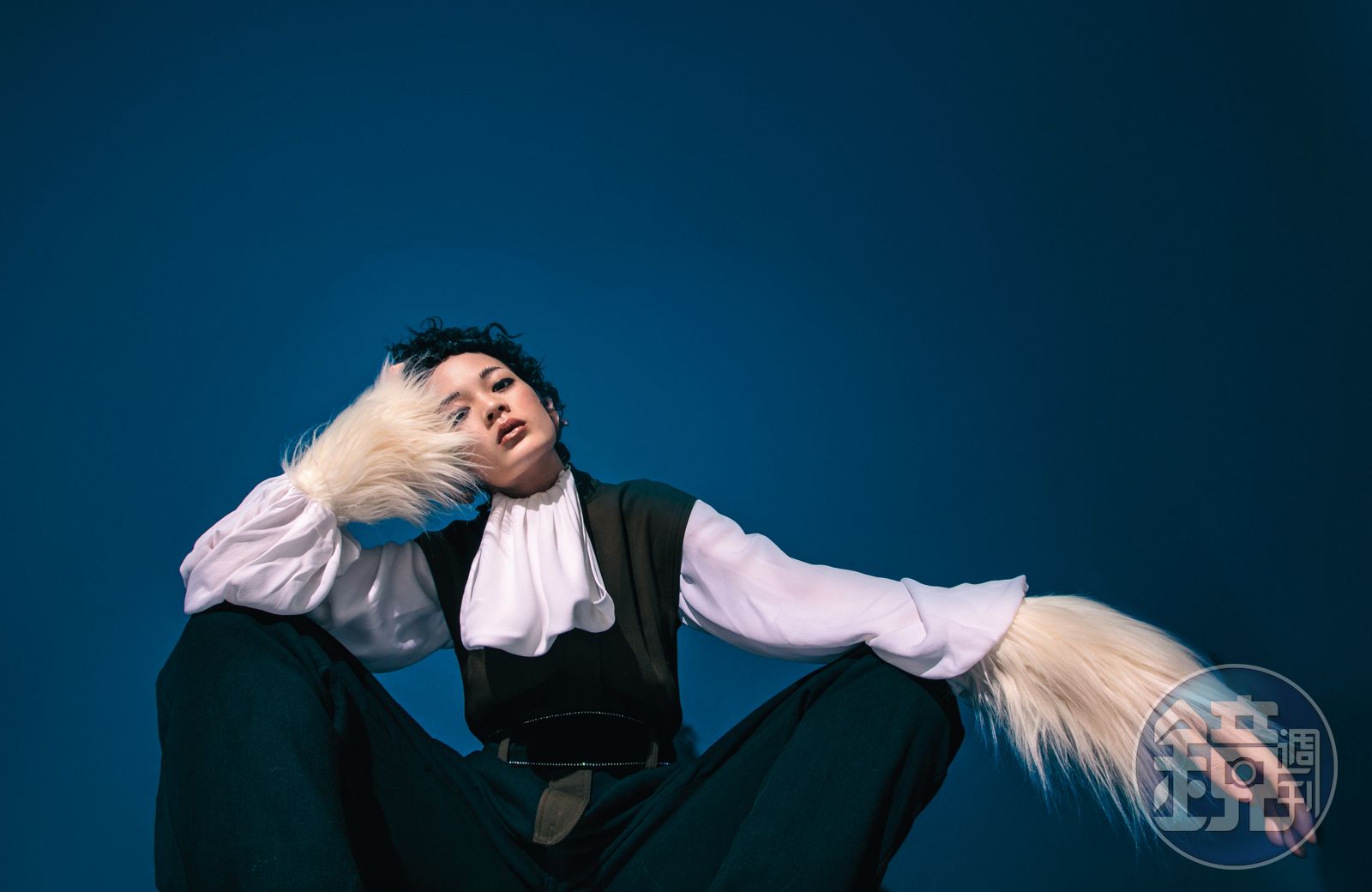 維多利亞風格白色襯衫 NT$46,000 by LOEWE/軍綠色拼接黑色連身褲 NT$69,000 by LOEWE/曲狀原木鍍金耳環 NT$40,400 by Bottega Veneta/純白人造皮草手套 NT$18,000 by GUCCI/ 沿邊鑲鑽腰綁帶 NT$6,030 by maje。