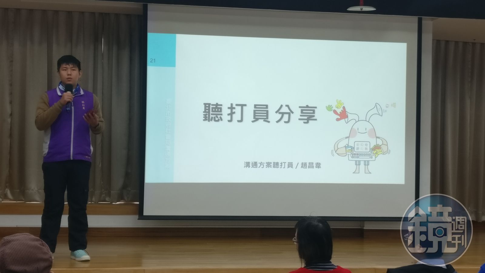 臺北市政府社會局科長林玟漪表示,「臺北市聽語障溝通服務方案」自105年起委託中華民國聽障人協會辦理,提供手語翻譯及聽打整合服務,聽語障民眾除了一般常見的洽公、就醫之外,亦能接觸各式各樣的公眾活動,如講座、記者會、座談會等,促進聽語障者參與社會,保障資訊平權。目前溝通方案同步聽打員正在招募中,歡迎有志之士透過上述電話向協會報名徵選和受訓,報名日期截止至108年12月10日(二)止。