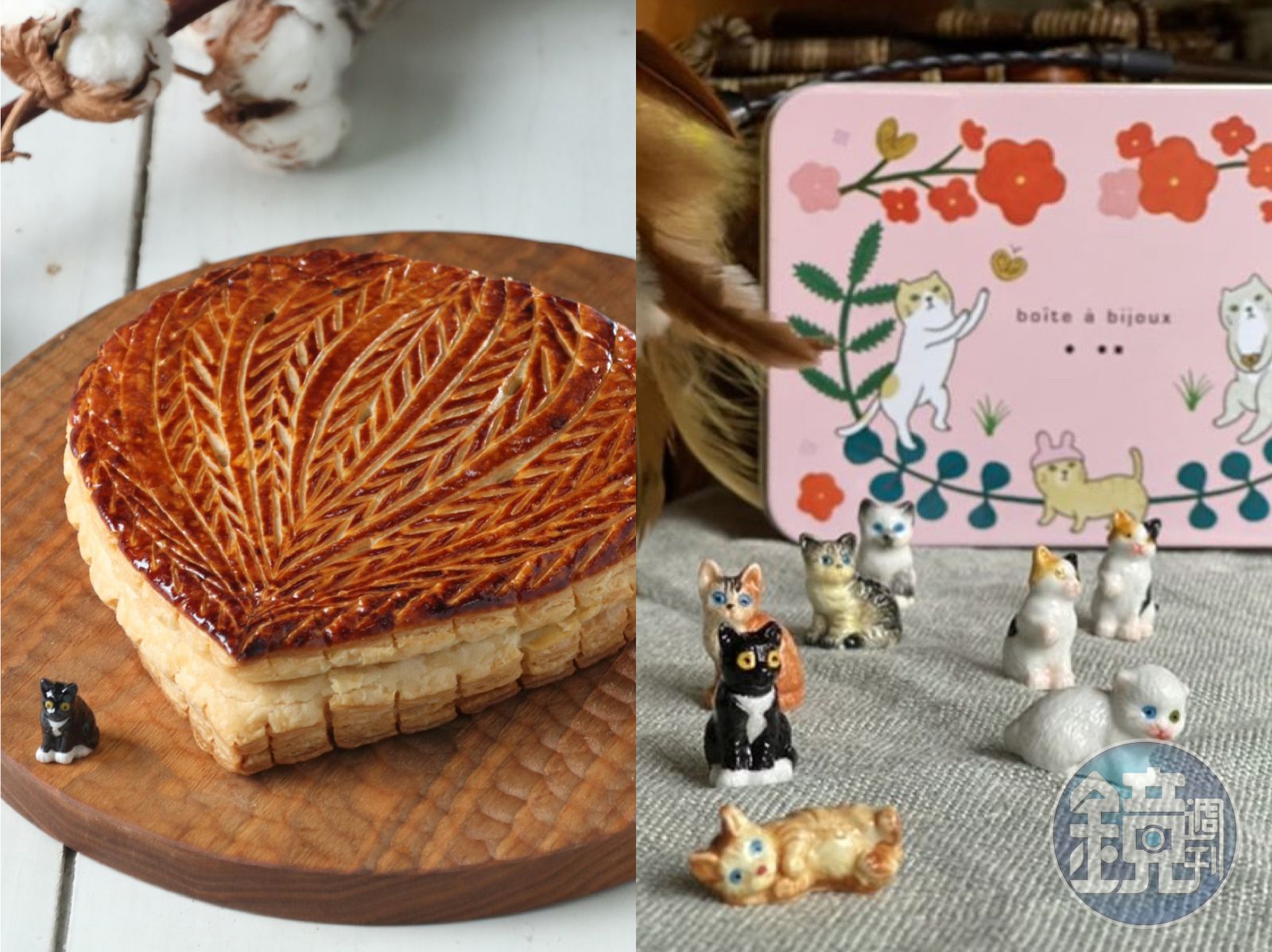 依循傳統,店家在每個國王餅內皆會包進一個法國進口瓷偶,咬到貓咪造型瓷偶的幸運兒,可以在活動期間內到店內兌換與貓咪社團聯名推出的鐵盒餅乾,數量有限,要把握機會,12月8日前預購耶誕商品還有優惠價。