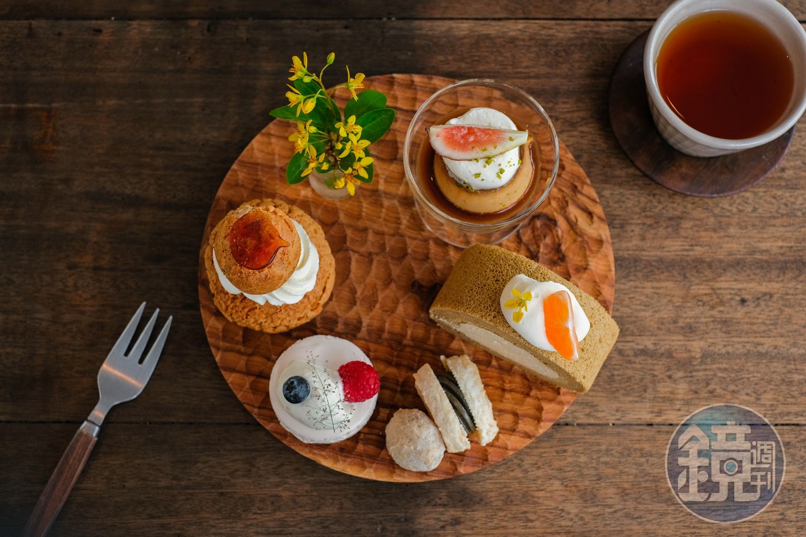 菜單上只有簡單的5款點心加多種咖啡飲品,最受歡迎的「霜空點心盤」,包含6種點心:原味香草布丁、焙茶蜂蜜蛋糕卷、芝麻達克瓦茲、胡麻雪球、覆盆子生乳酪、伯爵茶泡芙,不只視覺吸睛,個個細緻口感與多層次豐富味覺,搭配一杯阿里山紅茶,十分迷人。