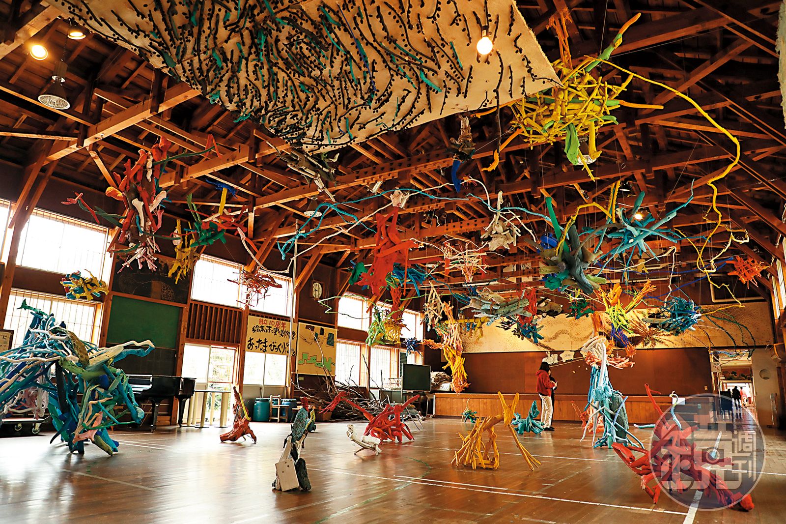 田島征三運用撿來的木頭,塗上各種顏色,綑綁成各種型態,據說創作當時附近的居民都來幫忙,有如真實地拾回過往的童年回憶。解說員羽鳥MEGUMI說,她的媽媽就是畢業自真田小學,這個村子的大姓是尾身,大都以織和服布料維生,聽說自己的學校以這種方式重生,媽媽也開心不已。