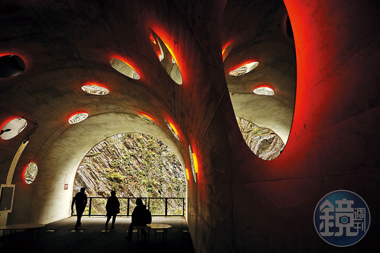 馬岩松在原本幽暗的隧道中加入五色燈光,用顏色區分各區域的功能特性,在燈光引導下,感覺很快便來到第一個「見晴所」,日語的「見晴」是視野遼闊的意思,岩壁的柱狀節理正好鑲嵌在出口,宛如一幅山水畫。