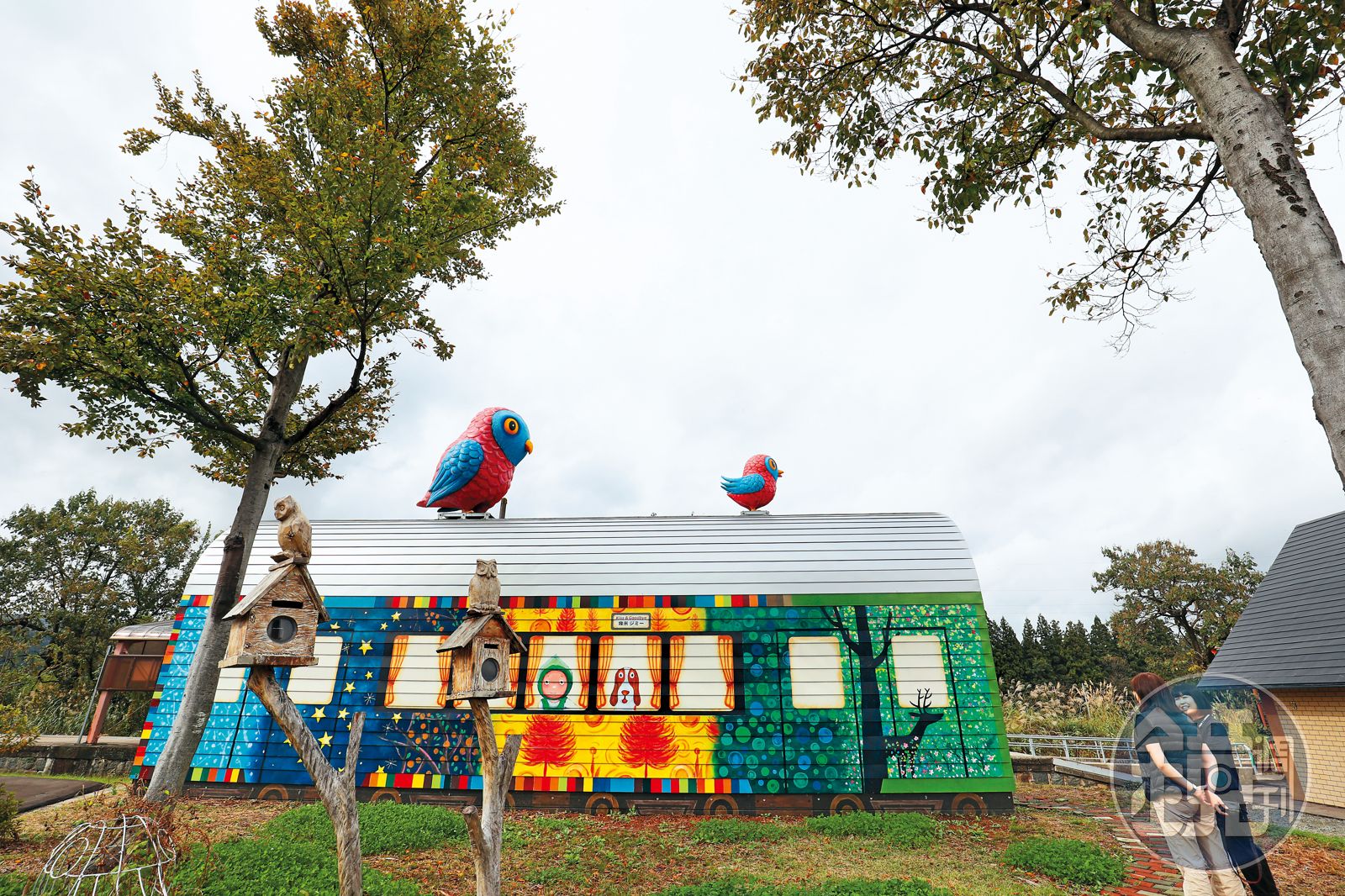 遠遠看,越後水澤車站旁的男孩,似騎在狗狗身上御風前行;土市車站旁的男孩,則帶著狗狗透過車窗往外看,頂上站著一大一小兩隻貓頭鷹,小樹與布丁的無邪眼神,傳達出幾米希望大家不要忘記幸福過往,保持勇氣繼續追尋愛的訊息。