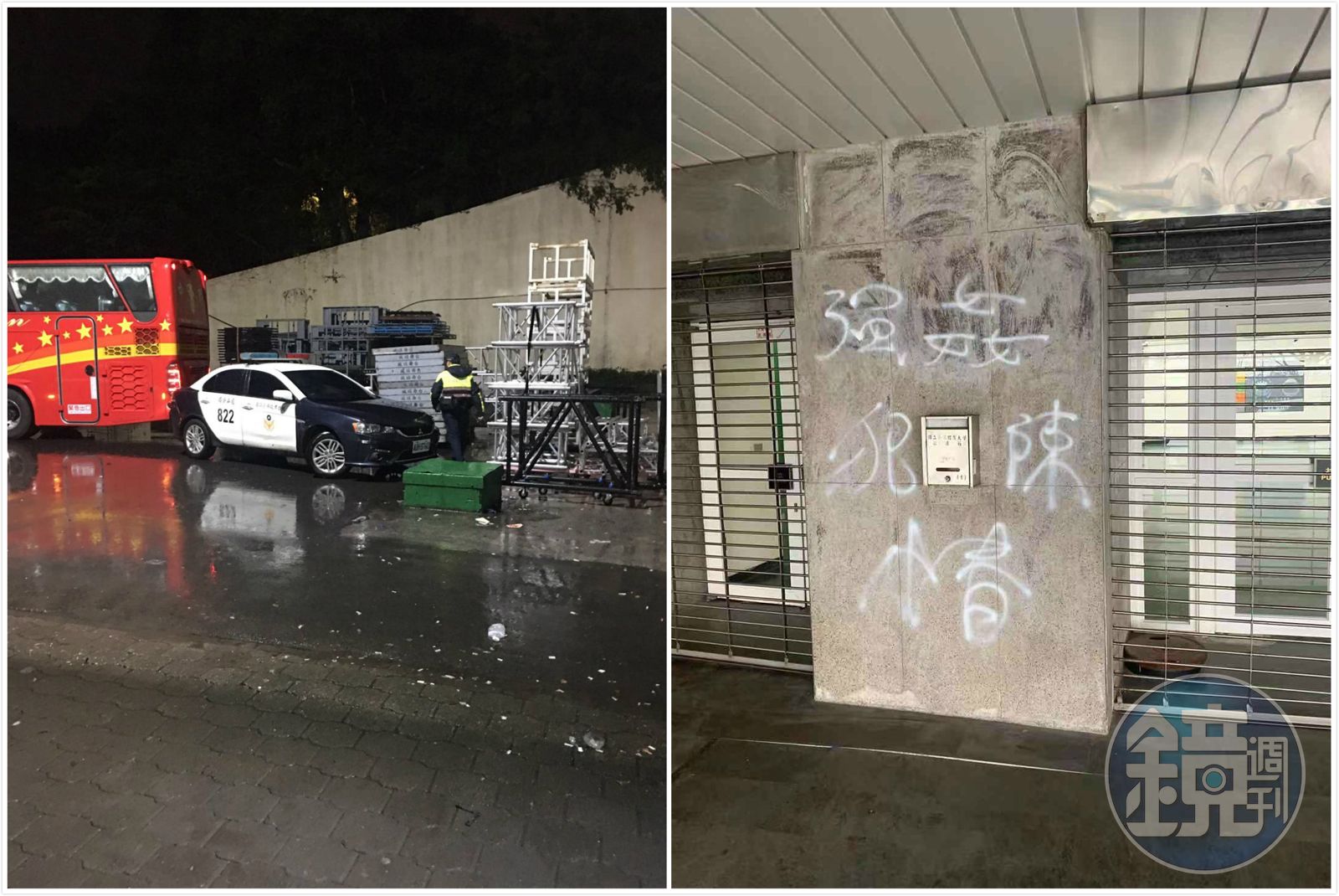 示威者在體育場面門噴字大罵:「強姦犯陳小春」,為怕有示威者搞事,警方增強人力。(讀者提供)發布時間:2019.12.07 15:18 臺北時間