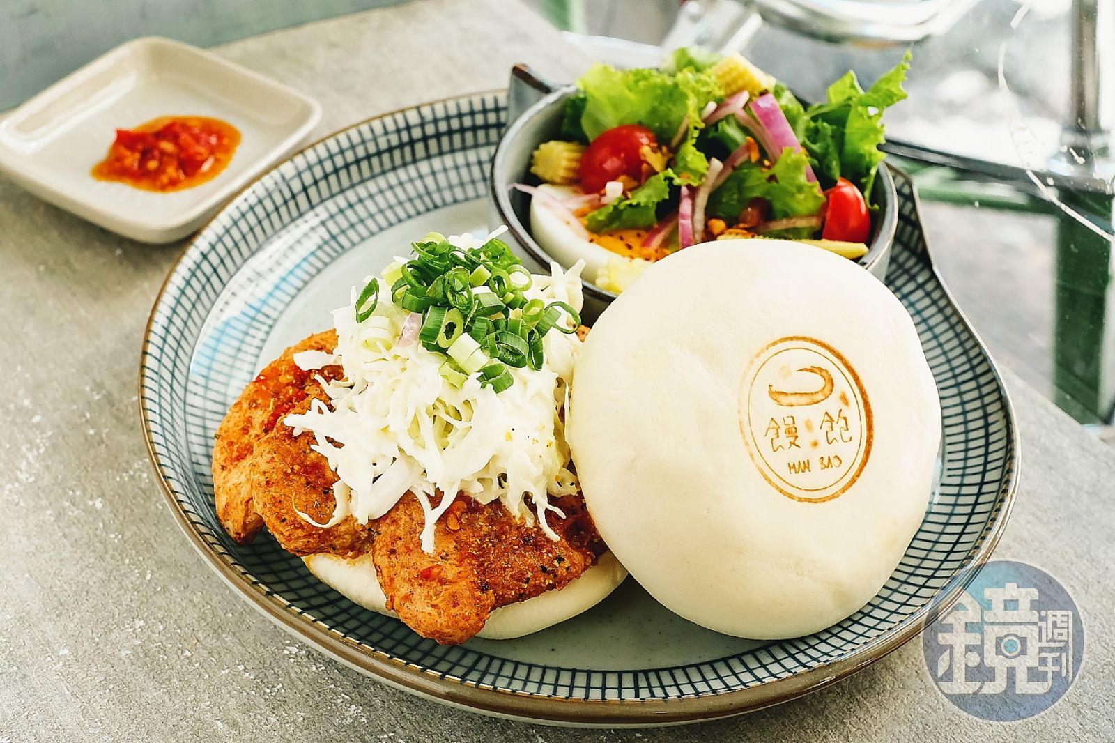 小郁( 左)與Jaiden(右)一起打造風格可愛又美味的「饅飽」。三面採光的大落地窗、黑白磁磚地板與木質吧台,走進饅飽瞬間就覺得時光慢了下來。花了半年時間,兩人終於找到認同他們想法的饅頭師傅,研發出形狀較薄的圓形饅頭,不但保留麵糰的咬勁,壓下去還能恢復蓬鬆度,不會一下就把醬汁吸光。人氣餐點「天麻椒香祕汁雞」使用以4種辣椒和蜂蜜等超過11種香料醃漬的雞肉,大口咬下能吃到饅頭濕潤Q彈的口感與吮指回味的內餡。