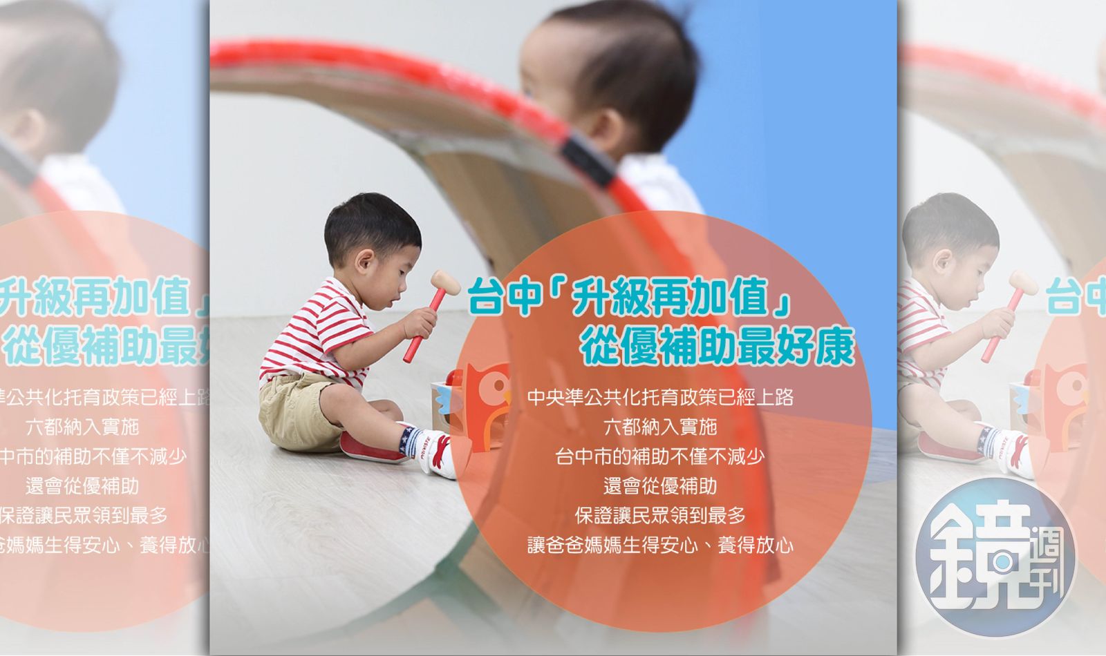台中市原2至6歲幼童首創進入準公共化托嬰中心或居家托育人員均補助3000元,自108年8月1日起中央教育部補助2至4歲育兒津貼,每月2,500元,再加台中巿政府獨有平價托育補助500元,共3,000元,民眾權益不變,確保幼兒受到妥適照顧。