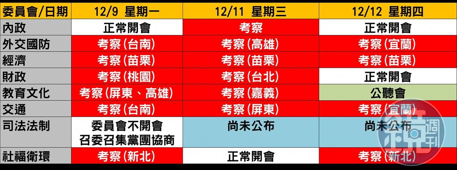 而在黃國昌貼出的本週立法院委員會議程中,只見24格原本應該要開會討論議程的委員會,有16格被填上外出考察,另有2格尚未公布,僅有4格正常開會,還有一格不開會,召委召集黨團協商。