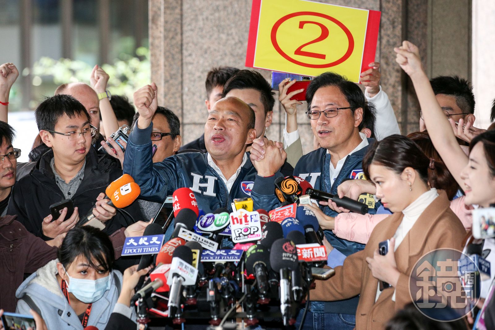韓辦發言人何庭歡表示,抽到2號代表「2支穿雲箭,國政雙贏」。韓國瑜則興奮得立即化身急智歌王,唱起《採紅菱》改編的歌詞:「我們倆牽著手呀選總統啊選總統!得啊得台灣安全,得啊得人民有錢,啊!就好像是倆兄弟呀!為人民呀!我倆一條心。」韓國瑜唱完還在現場發放巧克力,但不回應其他提問。