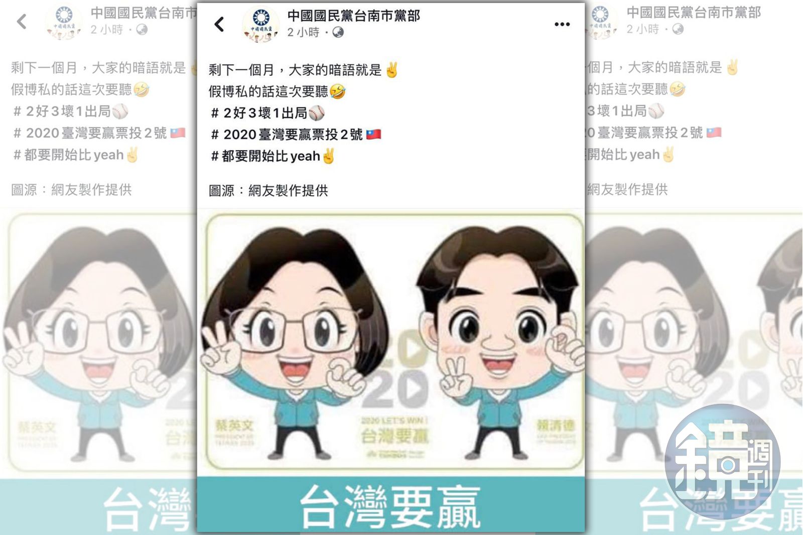 中國國民黨台南市黨部昨於臉書上貼出一張競選海報,文宣中的蔡賴Q版人像手比「2」,並寫著「台灣要贏票投2號」標語,貼文為「剩下一個月,大家的暗語就是2號,假博私的話這次要聽」「2好3壞1出局」,圖源則寫「網友製作提供」。該貼文一出隨即引發熱議,因2號實際上為國民黨候選人韓國瑜、張善政的號次。貼文發出一個多小時即被下架。