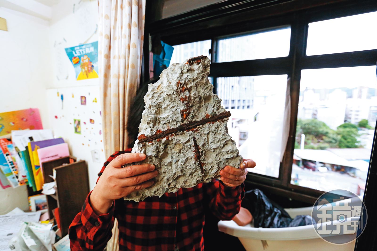 她指著客廳裡一張長方形的大理石桌說:「我跟你講,我們家的天花板就跟千層酥一樣,鬆鬆軟軟的,雖然有請人做過補強,但如果天花板掉下來壓到我女兒怎麼辦?所以我現在都把餐桌的椅子拿開,叫女兒每天晚上睡在桌下,我就躺在旁邊陪她。」