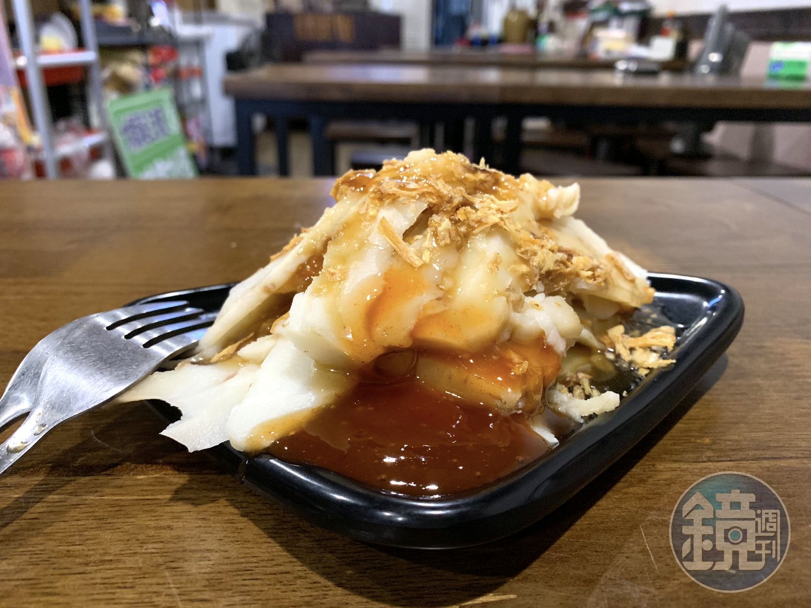 店內最特別的就是「油蔥粿」,作法是得將在來米、蓬萊米磨粉,加適量太白粉和水調成米漿,少量倒入模子後蒸熟,接著撒上油蔥配料,再淋一層米漿,如此動作得反覆數次,因此又稱九層炊,吃了還有聰明又嫁好尪的寓意。