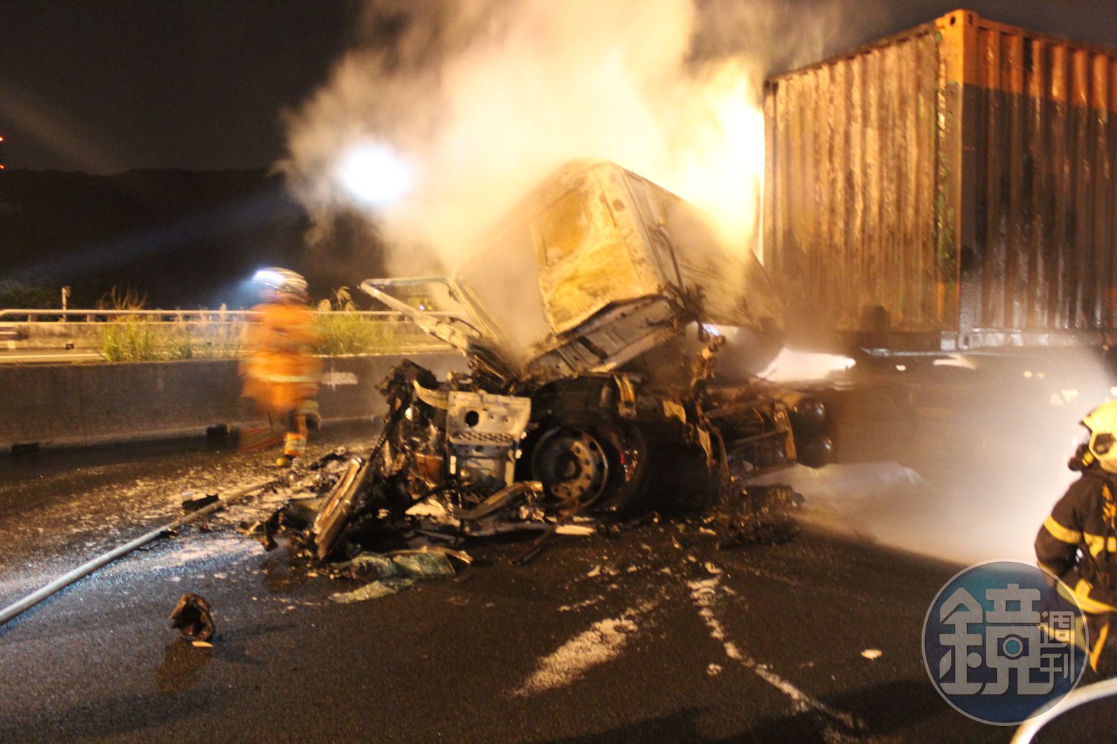 但當警、消人員到達時,追撞聯結車的貨櫃車頭已陷入火海中,警消拉水線灌救,直到4點25分才將火勢撲滅,火起時來不及逃生的邱姓妻子(37歲)及1歲幼女,則是不幸命喪烈焰中。