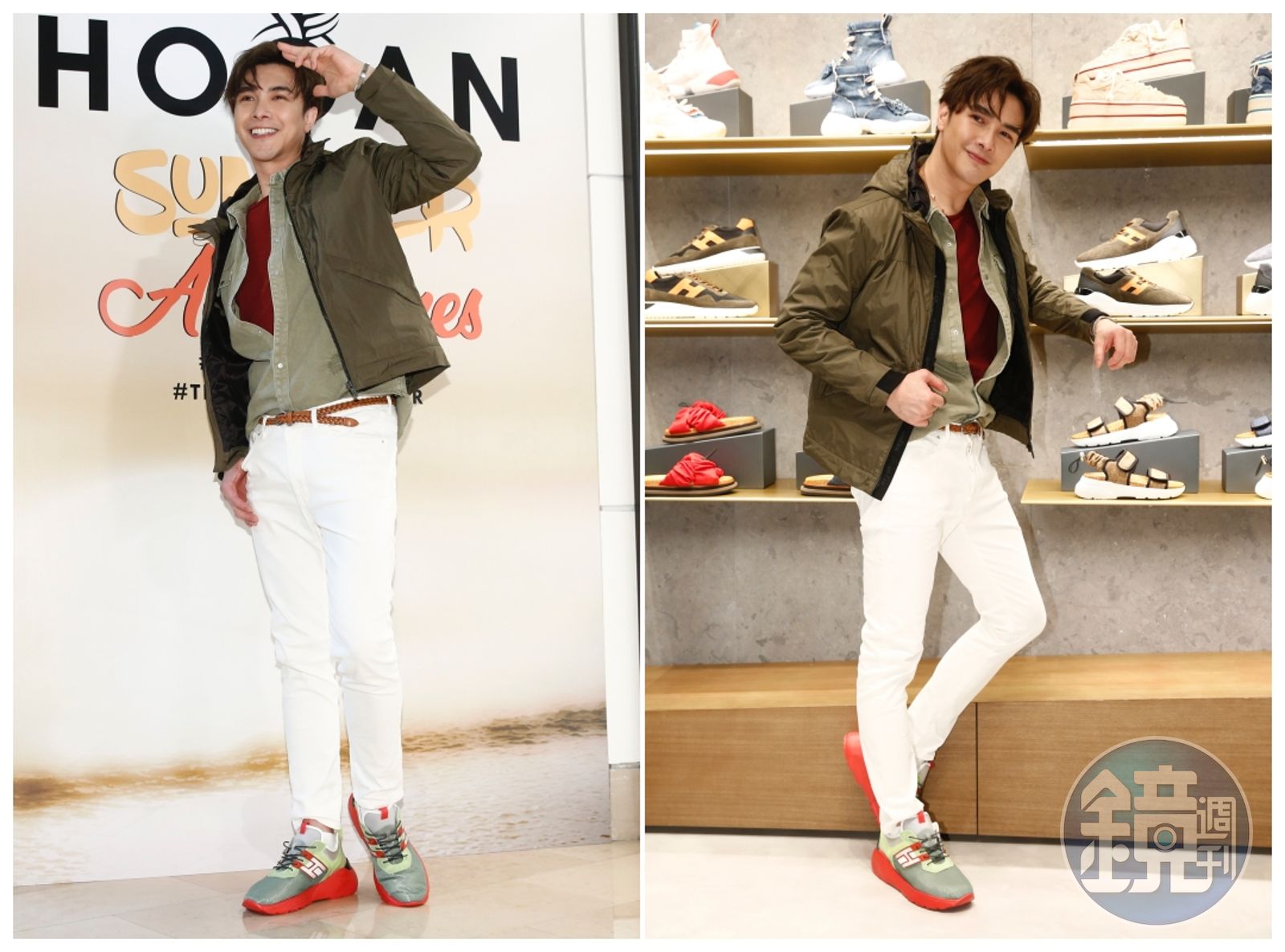 話鋒一轉,他聰明地把話題引到出席HOGAN品牌的鞋子上,「大家都要買一雙好鞋,這樣喝酒跌倒時才不會摔傷」,引起現場一陣笑聲。他表示喜歡HOGAN的加高鞋墊,「我身邊的朋友都心機很重,如果我沒加高鞋墊就會變矮了,所以穿上HOGAN會讓我增高到190公分,沒人可以比我高啦!」