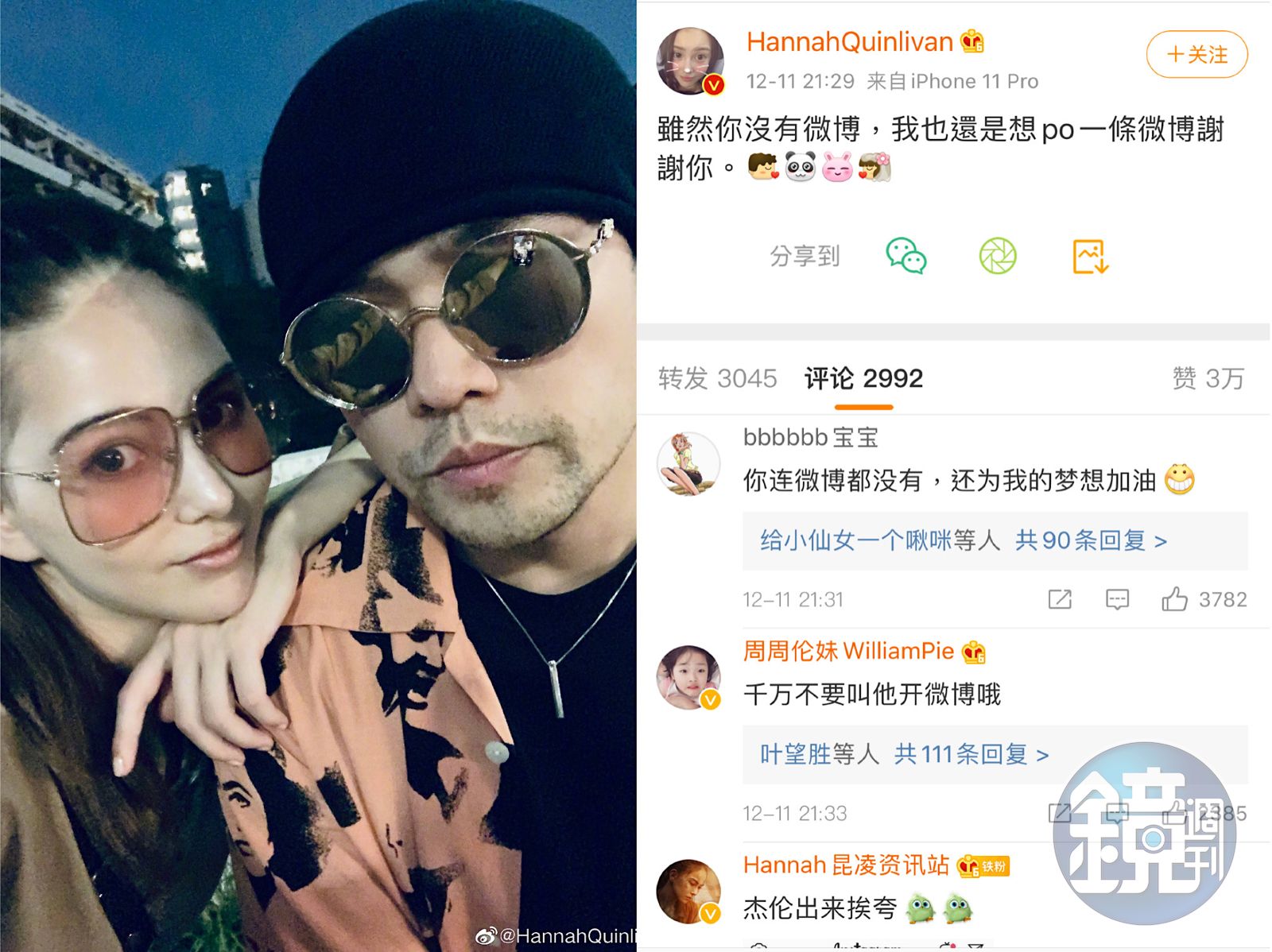 昆凌在微博上這難得的短短放閃20字,雖然沒指名道姓,但網友們都明瞭這位沒有微博的人就是他的天王老公周杰倫。留言一出讓網友引發熱烈討論,「甜到我頭殼疼」「阿阿阿狗糧阿」「這糖我吃了」,還有人勸昆凌千萬別讓周董來開微博。