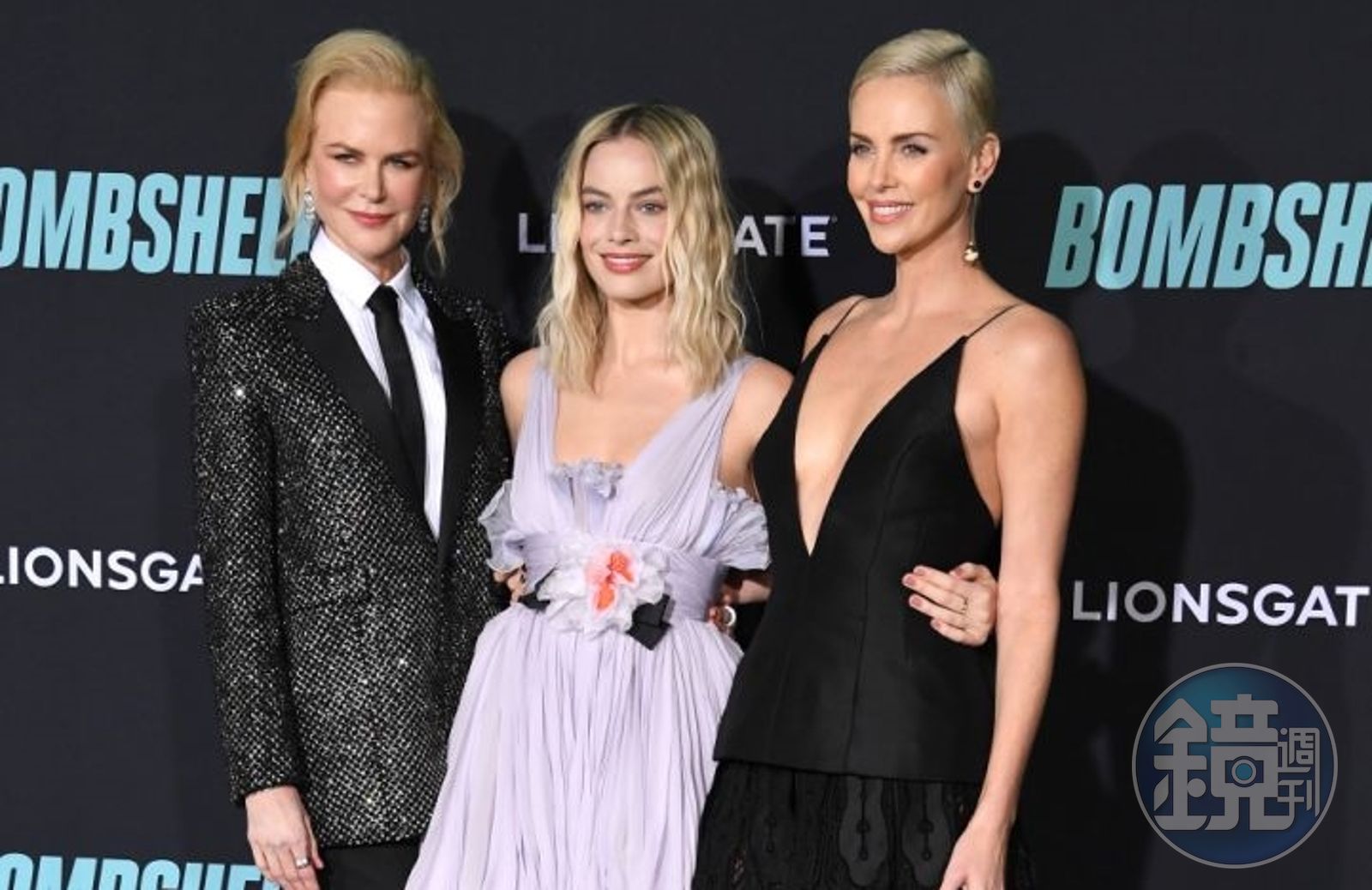 《重磅腥聞》昨晚於美國洛杉磯舉辦首映會,莎莉賽隆、妮可基嫚及瑪格羅比三女神在紅毯大鬥衣Q心機,相較於妮可基嫚帥氣的西裝造型及瑪格羅比甜美的淡紫色禮服,莎莉賽隆一襲超深V性感連身裙出場搶盡風采,因為她同時也是該片的製片人啊!
