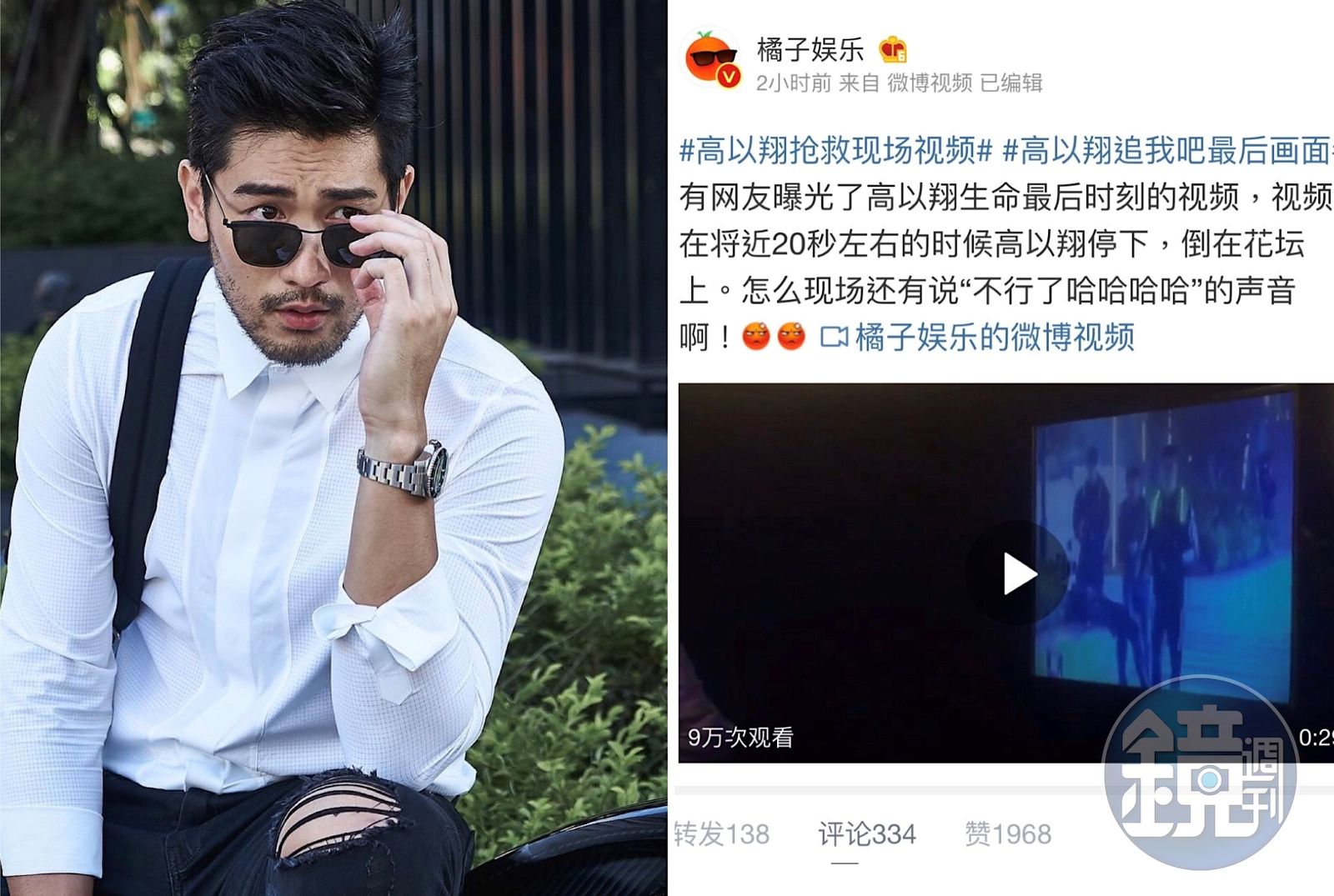 今日微博先是有網友公開高以翔倒地後急救影片,狠狠打臉電視台「即刻搶救」一說,短短30秒內容裡,完全看不到醫護人員前來,僅見到一位身穿黃色螢光衣的人員在替高以翔做CPR,重點還是在花壇上,而非平坦的地面上。這影片一出引來網友撻伐,「醫生呢!!不說有醫生嗎!」「哪裡有醫療設施?救護車在哪裡?」