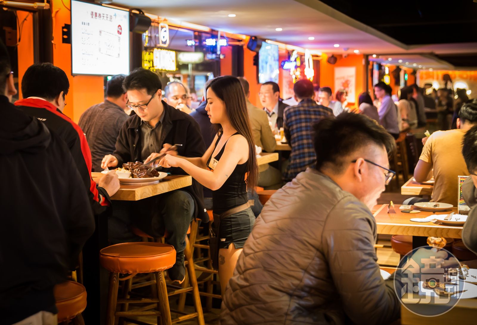 每晚8點一到,慶城街店內就放起全世界Hooters的共同歌曲,Hooters girl熱舞起來,表演準時開始。「現在全世界應該只有我們的Hooters girl還有在表演呼拉圈,美國都不表演了。」幾個年輕女孩表演拋接呼拉圈,大家看得驚呼連連,「她們也是拚命在練習,已經像特技了。還會設計跟客人互動的遊戲,所以很多公司會來我們這裡辦慶生會或尾牙。」