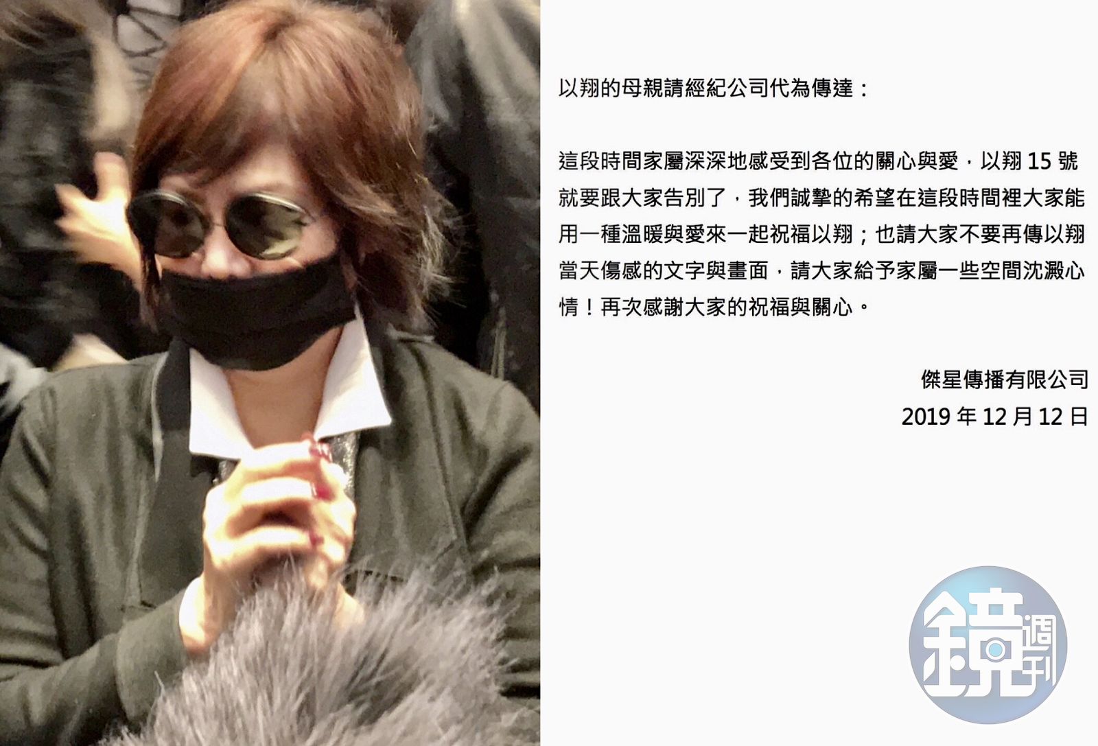 隨著高以翔猝死當天的畫面不斷在網路上瘋傳,雖然起因是網友們不相信電視台「即刻搶救」的說詞,每天都不斷流出新的影片來打臉浙江衛視。但每當影片播出一次,高爸爸、媽媽的心就痛一次,於是在昨晚,兩老透過經紀公司主動發出聲明呼籲媒體不要再傳以翔當天傷感的文字與畫面,「請大家給予家屬一些空間沉澱心情!」高媽媽表示,這段時間家屬深深地感受到各位的關心與愛,希望在這段時間裡大家能用一種溫暖與愛來一起祝福以翔。