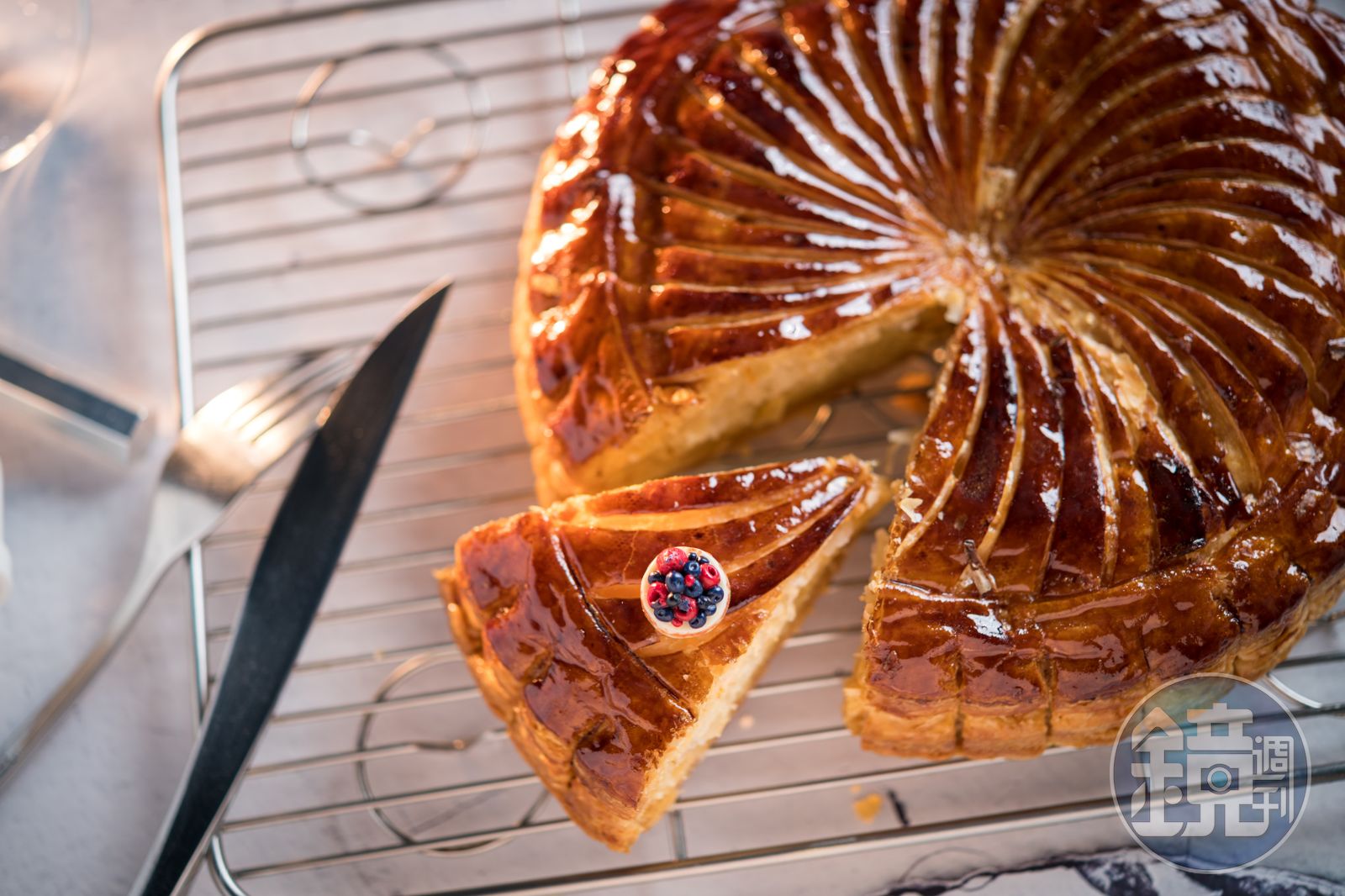 烤一顆國王餅有多費工?光是壓延派皮就耗費2天半的時間,為了讓包著杏仁奶油餡的千層派皮充分上色又不焦,還得分3段溫度來烤。而製造「空氣感」的關鍵則是內餡,「打餡的時候加入膠質增進乳化均質,如此一來質地更蓬鬆,口感也會更輕盈。」洪守成說。聚會自用兩相宜,國王餅每年開賣,幾乎都是上百個起跳。