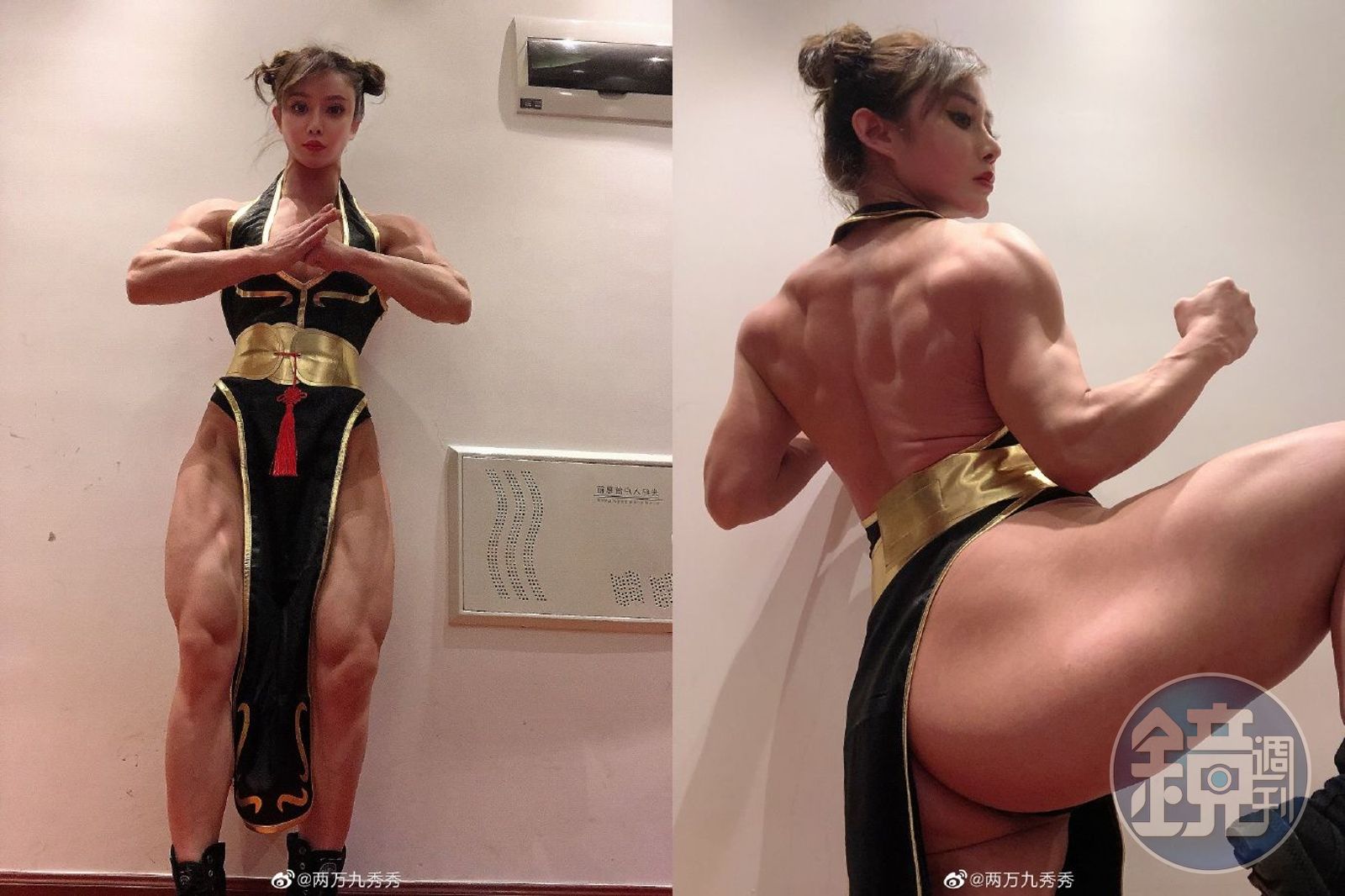 袁合榮昨(12)日分別在她的IG跟微博上傳了多張扮演《快打旋風》知名角色「春麗」的照片,她穿著低胸、背部及大腿兩側鏤空的「春麗裝」,綁起兩個包頭,加上滿身的肌肉,跟電玩中的春麗形象相似度極高。而她在照片中的踢腿動作,讓大腿肌肉展露無疑,更被網友說是春麗健壯大腿的「神還原」。