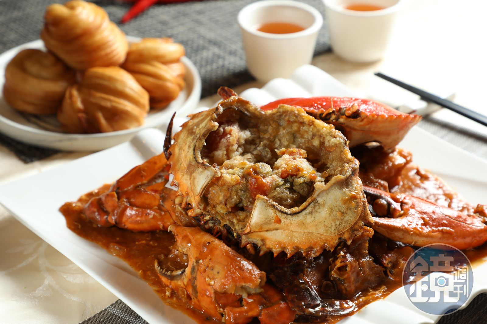 除了守住父親的老味道,呂俊賢也不斷在擺盤或作法上創新,例如融合泰國或星馬地區的海鮮料理手法,「星洲醬沙公蟹」就是嘗試之一。醬汁以番茄和冰糖為底,辣度來自紅咖哩醬,另外還有南薑、香茅和少許印度咖哩粉提味,讓蟹肉除了鮮甜味,還有豐厚的香氣層次。