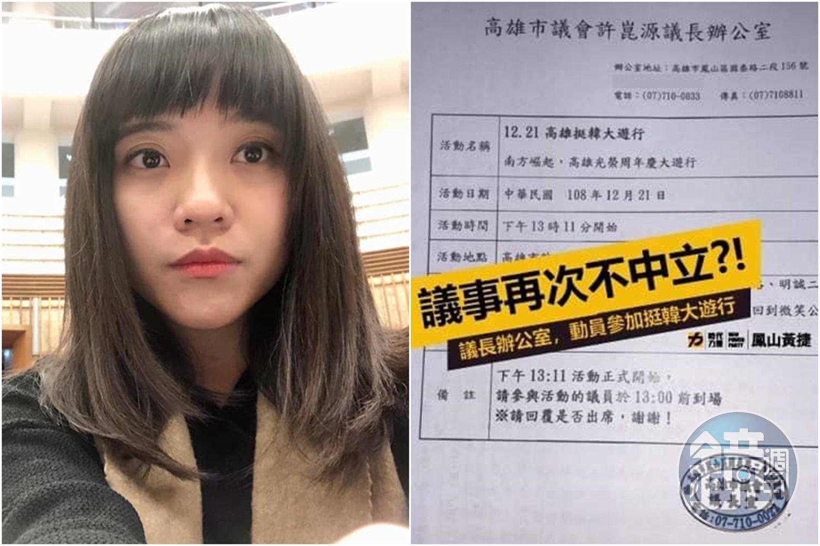 黃捷表示,這禮拜議長室發出要求議員參加1221挺韓大遊行的通知,還大剌剌地蓋上議長室的章。她認為,許議長挺韓眾所皆知,如果用個人身分參加遊行,市民管不著,「但公然使用議會資源發通知,就是議事不中立,議會的秩序再次蕩然無存。」