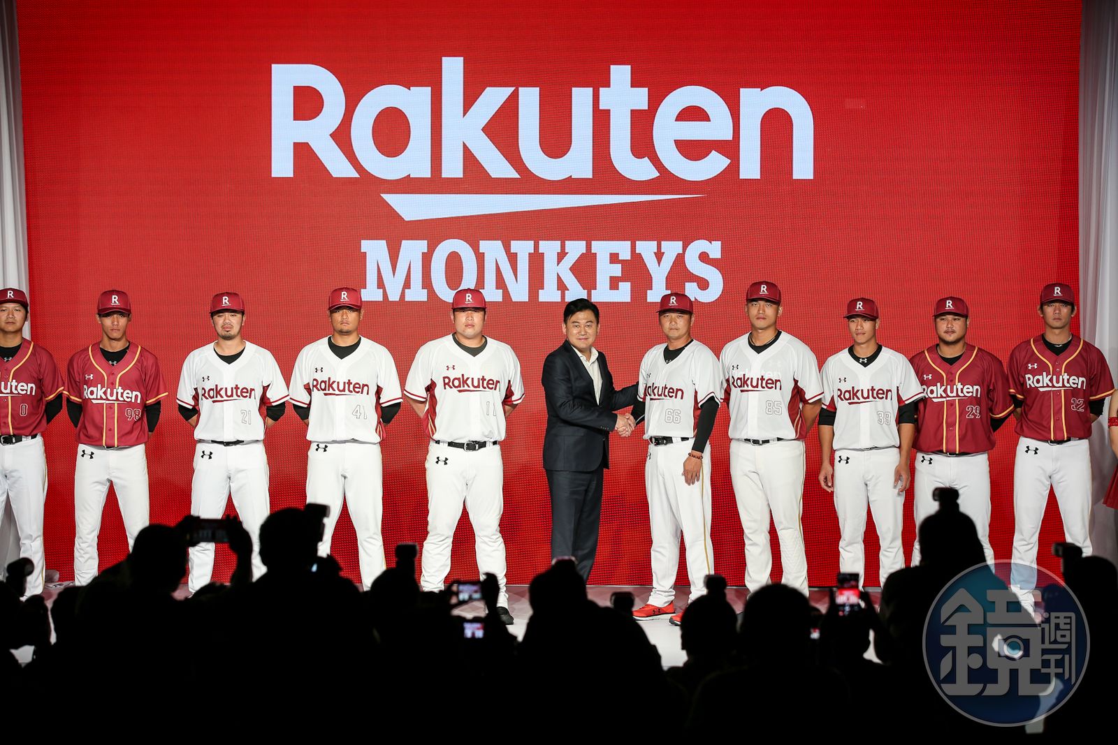 樂天桃猿郭嚴文(左3起)、王耀霖、林泓育、樂天執行長三木谷浩史、新總教練曾豪駒、朱育賢與林立。樂天桃猿曝光主客場球衣。 樂天桃猿記者會上曝光的球隊主、客場球衣首度曝光,沿用日職樂天金鷲隊的「樂天紅」色系。由於樂天集團首次進軍台灣職棒,新球隊領隊仍由原領隊劉玠廷續任,成為樂天桃猿首位領隊,而總教練則在洪一中遭挖角去職後,由曾豪駒升任。記者會上,曝光的新隊名稱「樂天桃猿」,英文為「Rakuten Monkey」,樂天保留原隊名特色,延續球迷記憶,主場球衣為白色、客場球衣則是紅色。
