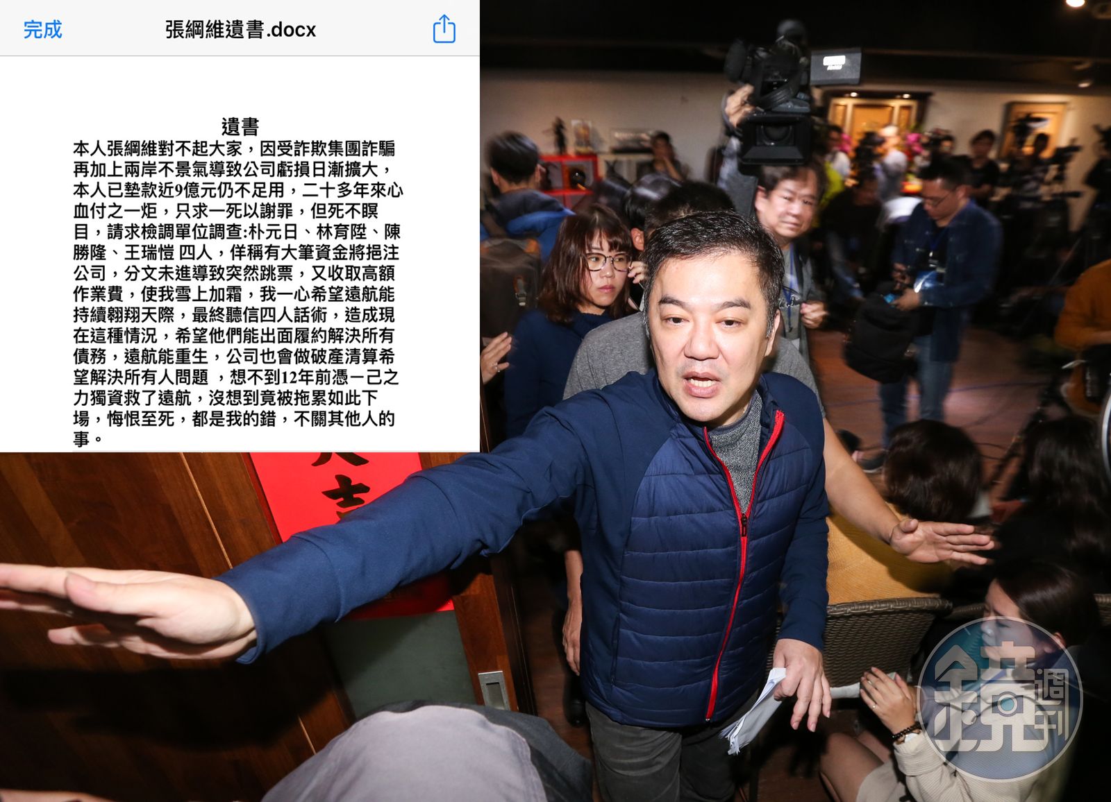 張綱維還把財務危機推到詐騙集團身上,因為他被騙錢,墊付9億元才出事,他的遺書中提到:「…:因受詐欺集團詐騙再加上兩岸不景氣導致公司虧損日漸擴大,本人已墊款近九億元仍不足用……請求檢調單位調查:朴元日、林育陞、陳勝隆、王瑞愷4人……佯稱有大筆資金將挹注公司,分文未進,導致突然跳票,又收取高額作業費…希望他們能出面履約解決所有債務,遠航能重生……」