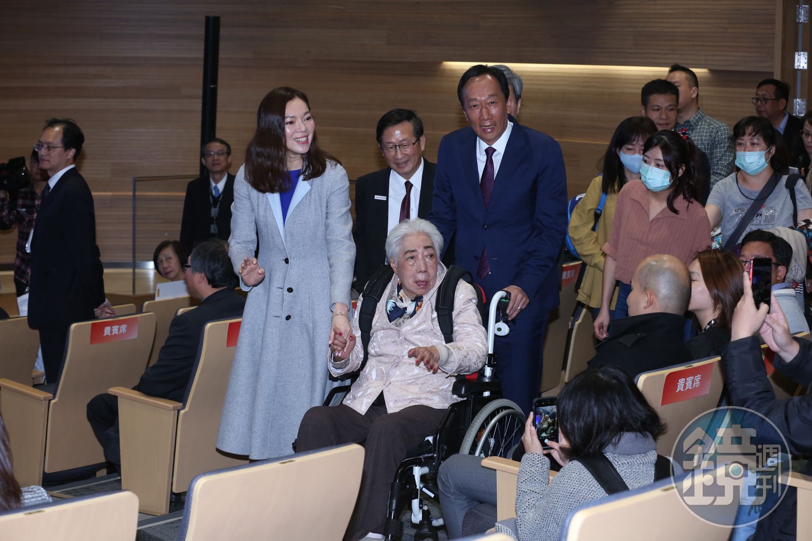 出席冠名典禮的除了郭台銘、初永真以及曾馨瑩以外,還包括台大校長管中閔、前校長楊泮池、李嗣涔、台大癌醫院長鄭安理以及台大醫學院長倪衍玄等人,管中閔在致詞時表示,很高興今日看到郭老太太親自到場,剛剛問了郭董,才知道老太太與我母親同歲,不同的是郭老太太身體硬朗,一餐還可以吃兩碗乾飯。」