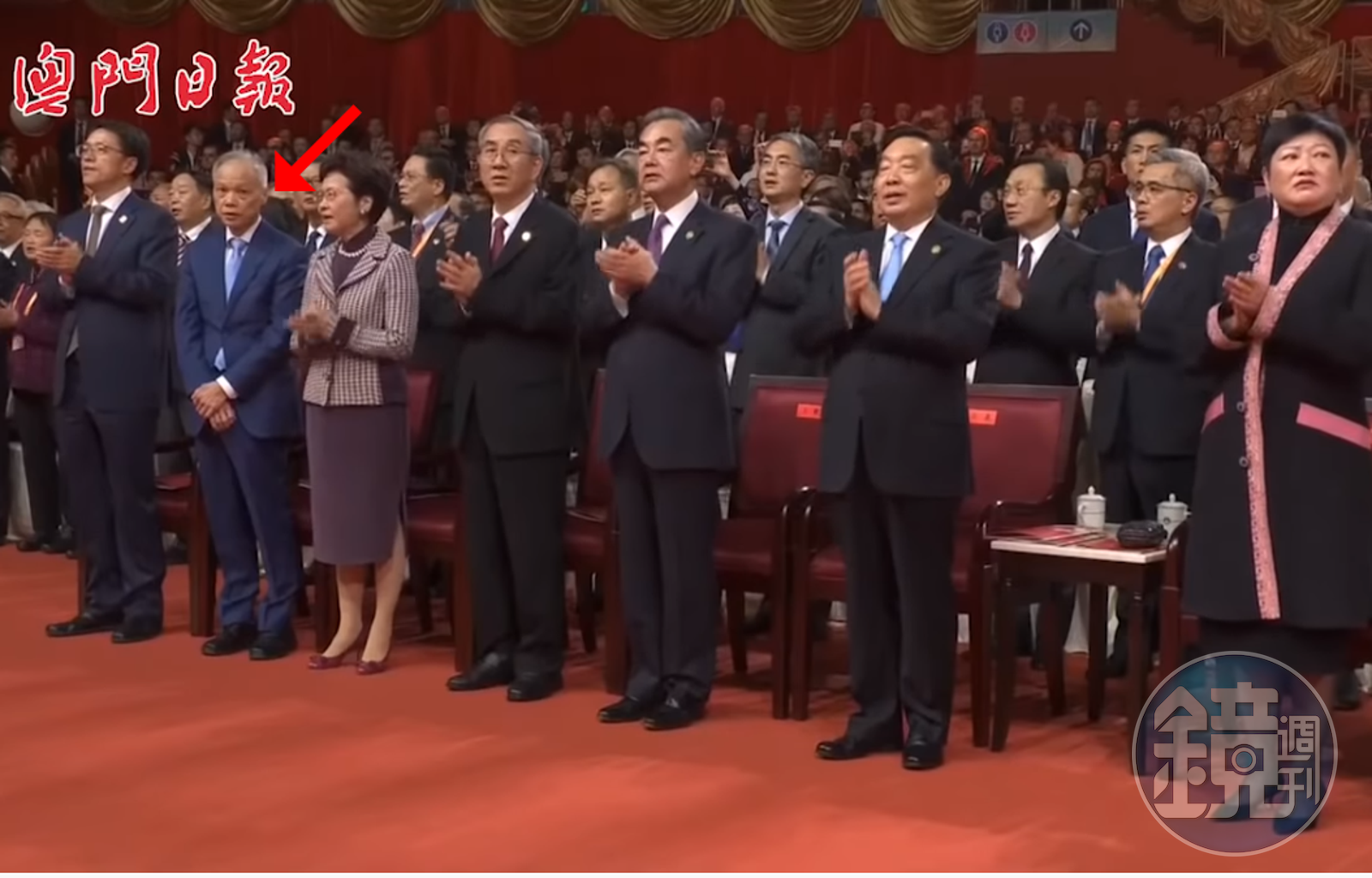 但突然鏡頭帶到一個突兀的畫面,站在林鄭月娥和港澳辦主任張曉明之間、身穿藍色西裝的林兆波,卻將雙手交疊於大腿前,並未跟著拍手,嘴巴僅僅微張,目光也有些呆滯木訥,在一群熱烈拍手的人之間,顯得非常搶眼。