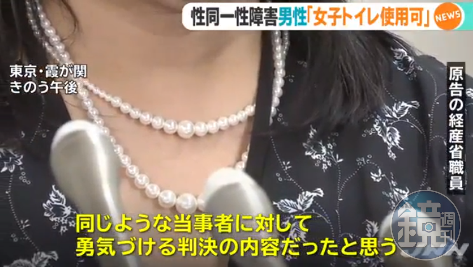 日本經濟產業省一名跨性別職員(生理上仍為男性),多年來以女性身分與裝扮生活著,卻苦於無法正大光明地使用女性廁所。「她」向東京地檢署提出告訴,主張經產省以生理性別為由,限制她使用工作地點的女性廁所,屬於歧視,並要求當局賠償。12月12日,這個持續4年的告訴終於獲得勝訴,。