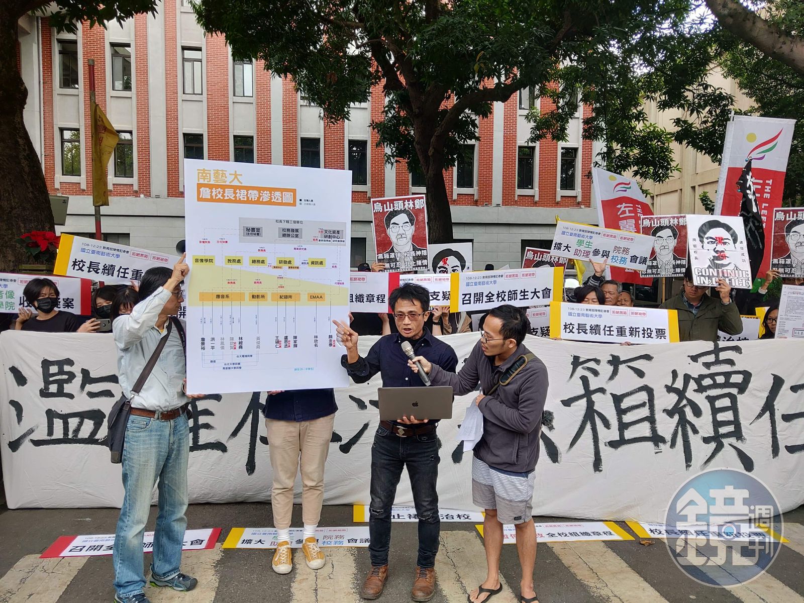 師生要求教育部盡監督責任,不應勉強給予續任聘書,高教工會等團體也到場聲援,並提出「校長續任重新投票;調查音像學院收支疑案;停止裙帶治校;擴大學生及助理參與院務及校務會議;召開全校師生大會」等5點訴求。