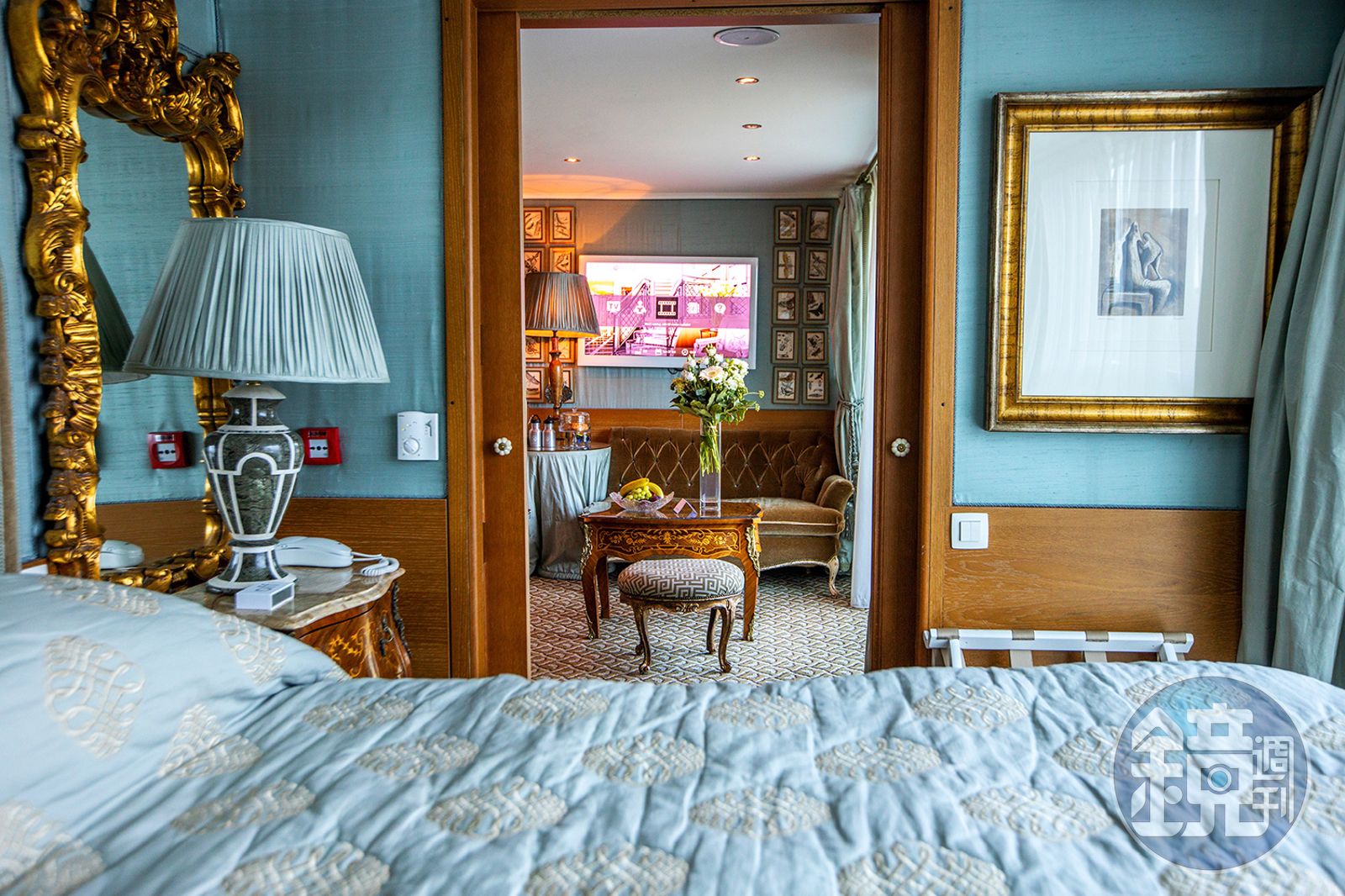 推開房門,巴洛克式的華麗裝潢,宛如走進18、19世紀的宮廷,尤其套房區的艙房就有近十種不同風格,繽紛花紋的寢具、地毯、牆上掛著的畫作,即便是重遊客,每次住進不同艙房,仍充滿蒐集樂趣。