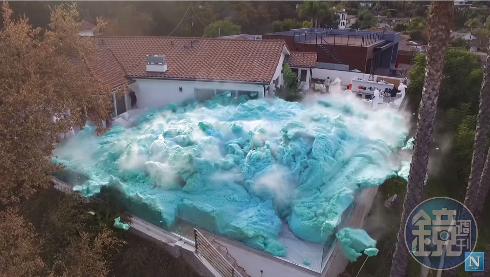 影片中眾人在穿好防護衣物後,便一同將催化劑倒入裝有溶液的塑膠桶內,隨即工作人員轉身拔腿四散。不料下秒藍色泡沫便猶如火山爆發,大量噴出且向四周擴散,寬敞的後院瞬間被淹沒,有些工作人員甚至來不及逃跑,畫面相當震撼。