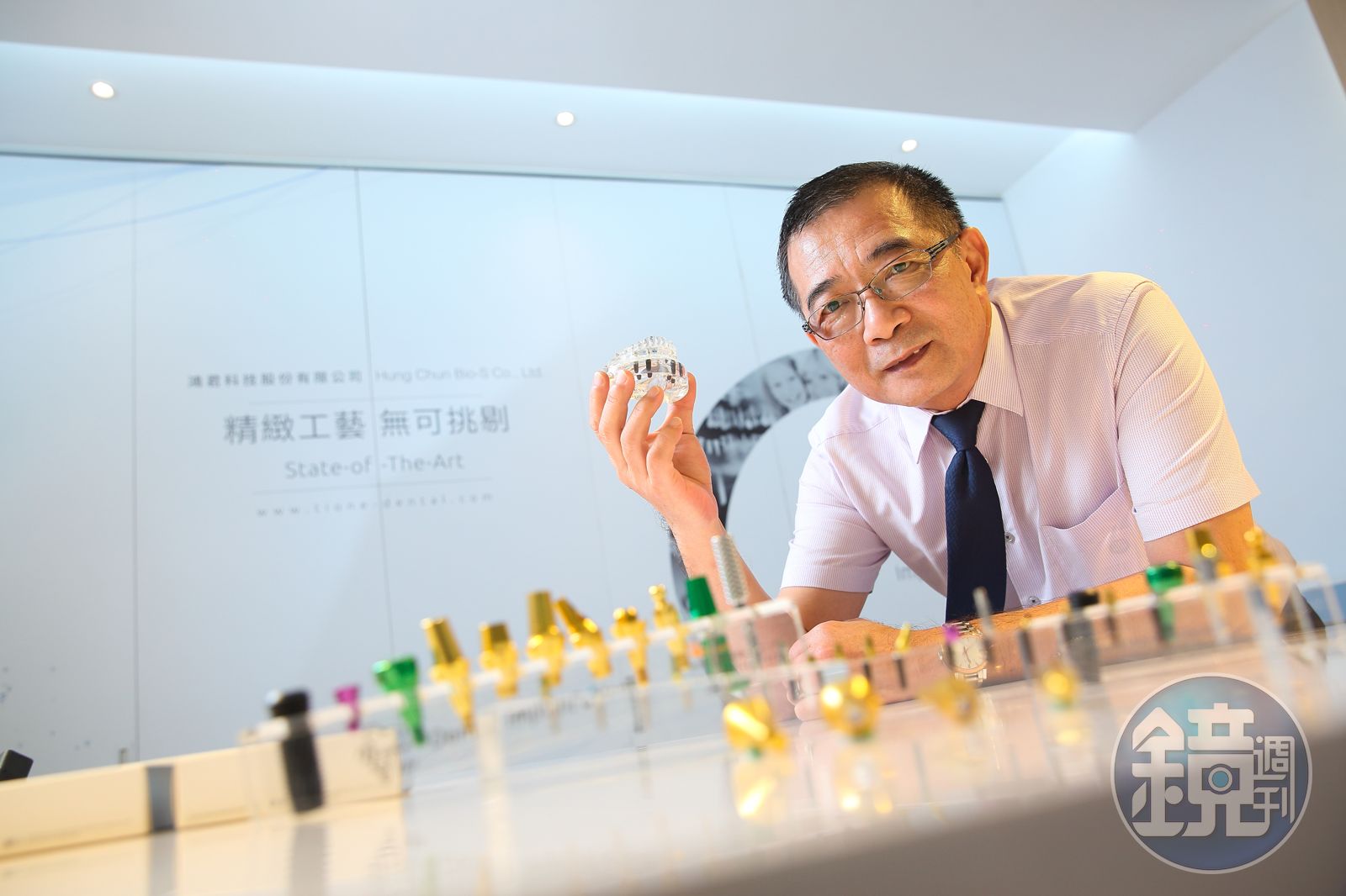 上午8點,國內人工牙根龍頭鴻君科技員工排隊等電梯,董事長鄭鴻君卻連1分鐘都不願枯等,三步併作二步爬樓梯上3樓辦公室。「工作就是我的最大興趣,創業29年來,就算前一晚喝醉、生病,隔天照樣準時進公司。」急性子的他,早上7點先巡模具廠,接著坐鎮牙材廠,2間公司都用他的名字命名,透露「只許成功不許失敗」的決心。