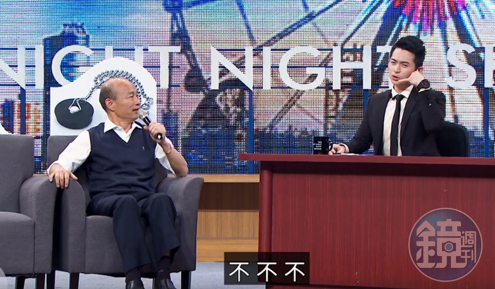 博恩則追問「我要一個國家的名字,什麼國家?」韓國瑜回應,我們是九二共識,我們是中華民國,對岸在聯合國世界公認叫做「中華人民共和國」,再說「我們是九二共識,我們是中華民國」,我們要維護台澎金馬所有生命財產的安全,因此在九二共識基礎之下,我們希望能維持自己的主權,然後強調「和」這個字最重要,並認為藍綠競爭太厲害,希望能夠和諧兩岸能和平交流,對世界各國因為台灣沒有資源,所以希望和氣生財,要跟全世界做朋友。而博恩再一次追問韓國瑜「國家名字」的問題,韓國瑜則找博恩PK拉筋動作,引台下一片笑聲。