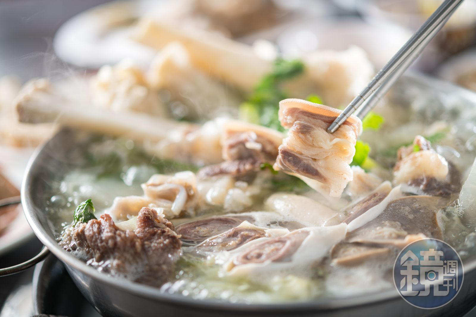 羊下水因鮮度高,無需複雜調理就鮮美無雜味。帶皮慢火煮熟的「羊腿」皮糯肉嫩,有黏嘴的快感。(350元/小份)「我們的鍋口味比較清淡,所以搭配的豆瓣醬和醬油膏也特別選過,比較甘甜不死鹹。」揚棄一切遮掩手段,配料僅僅是蘿蔔和蒜苗、芫荽,甚至沒有加酒鎮腥,這素面朝天的清燉羊肉卻毫無羶氣,連怕羊騷味的攝影都說厲害。