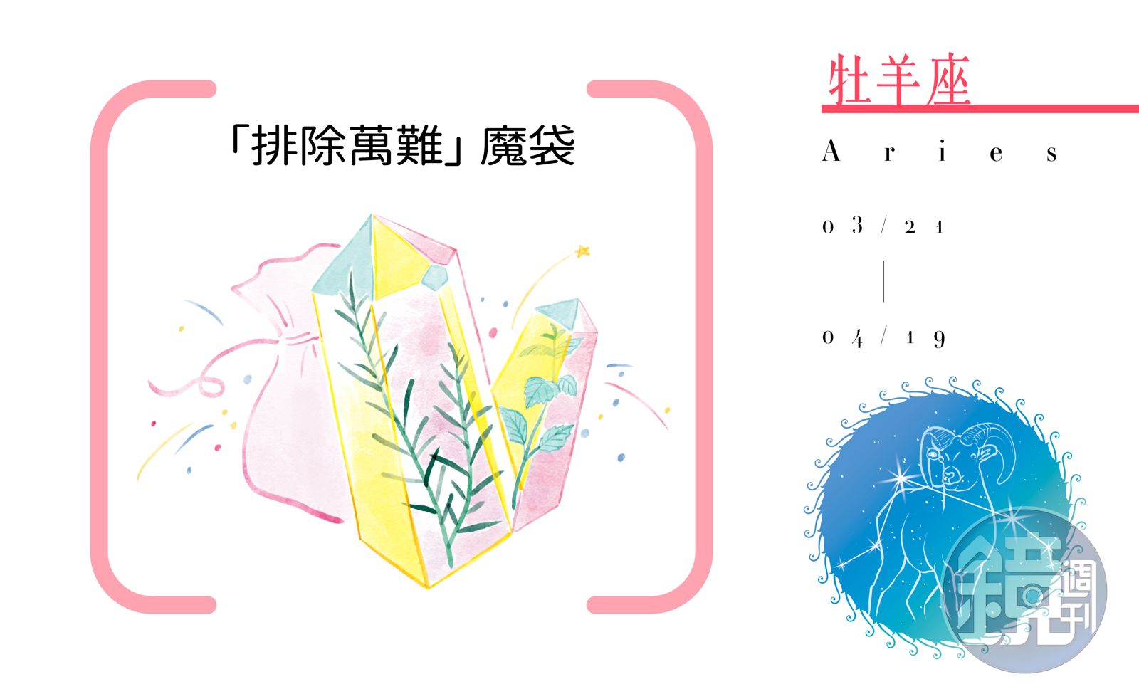 - 祕法:把最重要的工作目標表列清單,再把清單放進自製的圓夢「魔法錦囊」。袋中放入有助思慮清晰的透明水晶、增強記憶力的迷迭香、增進專注力與主動性的紅瑪瑙,與具有激勵與充電效果的薄荷。能量轉弱休息時,拿出香囊靈性充電、專注問題,有益。