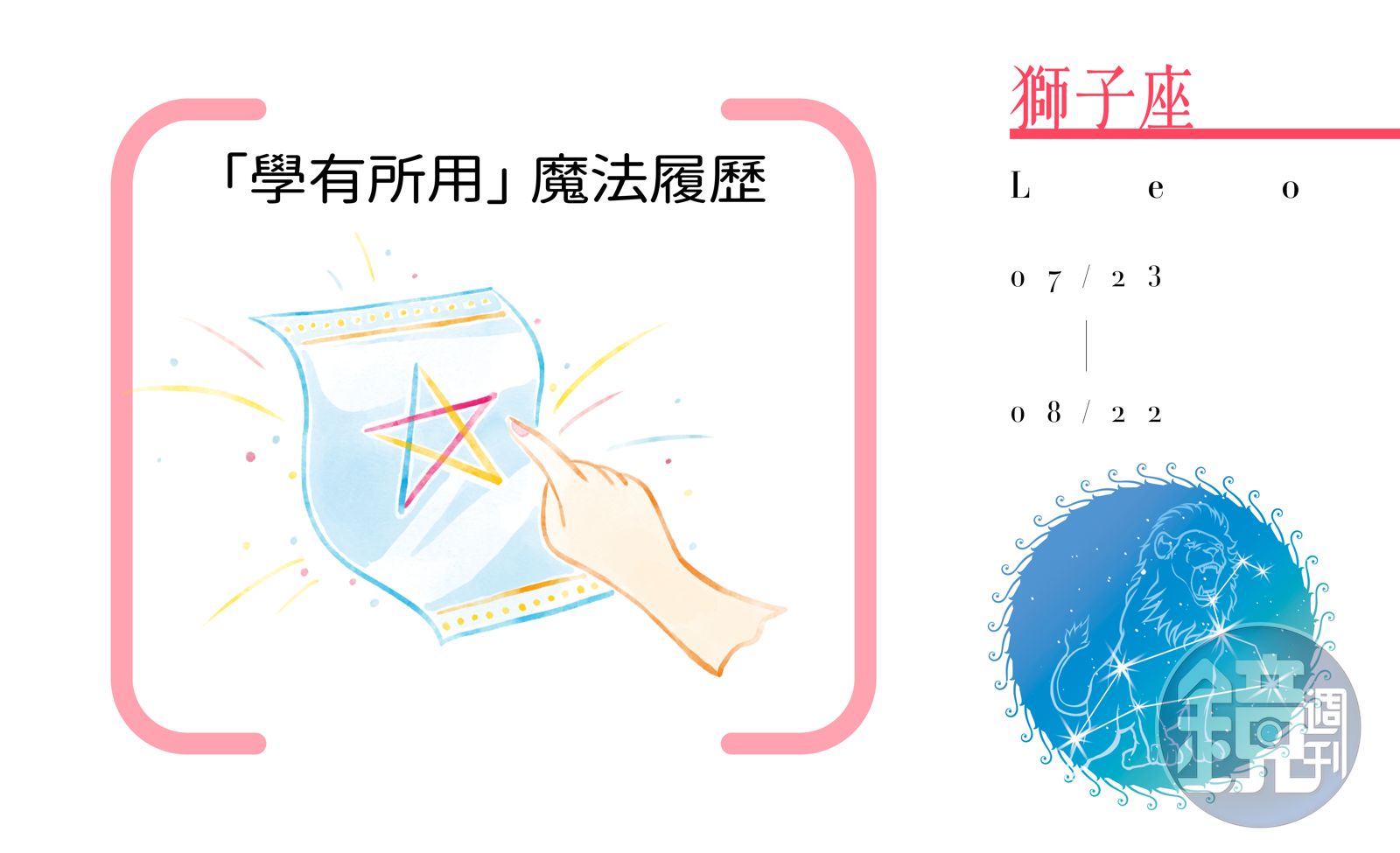 - 祕法:求職順利的輔助魔法。除了注意大環境時勢與自己的當旺時機,提早卡位;密切注意徵才管道或機構訊息,擴大到親友師長圈探詢機會;最重要的是一張紮實有料、充滿說服力的履歷。履歷投遞前,以指尖在履歷輕畫五角星,默禱應徵成功,幸運度增。