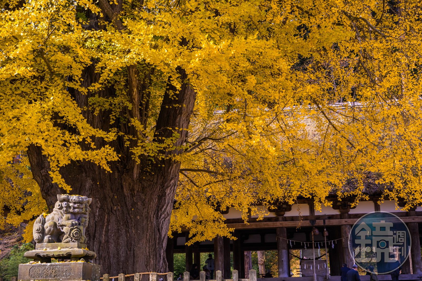 落葉時的800歲銀杏樹場景實在攝人心魂,即使四周的紅葉、銀杏大都已落葉,這棵老銀杏的樹梢上仍滿是黃橙橙的金色,葉子像一個一個的願望落下,走在厚厚的葉片上,我連腳步都輕了許多,深怕踩壞這一片美好。