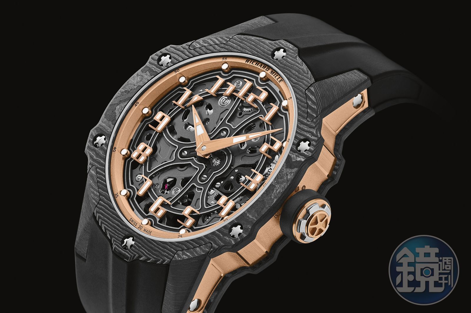 此次全新的RM 33-02在前代RM033腕錶的基礎下重新發展,並使用上近幾年RICHARD MILLE經常使用的Carbon TPT®碳纖維材質。而錶殼中層則是以紅金材質製成,前者有著強烈運動感,後者則呈現出奢華質感,對比鮮明卻又完美融合。而刻度與指針也使用上紅金,辨識度佳。全新RM 33-02限量140只,定價瑞士法郎140,000元(未稅,折合台幣約430萬元)。