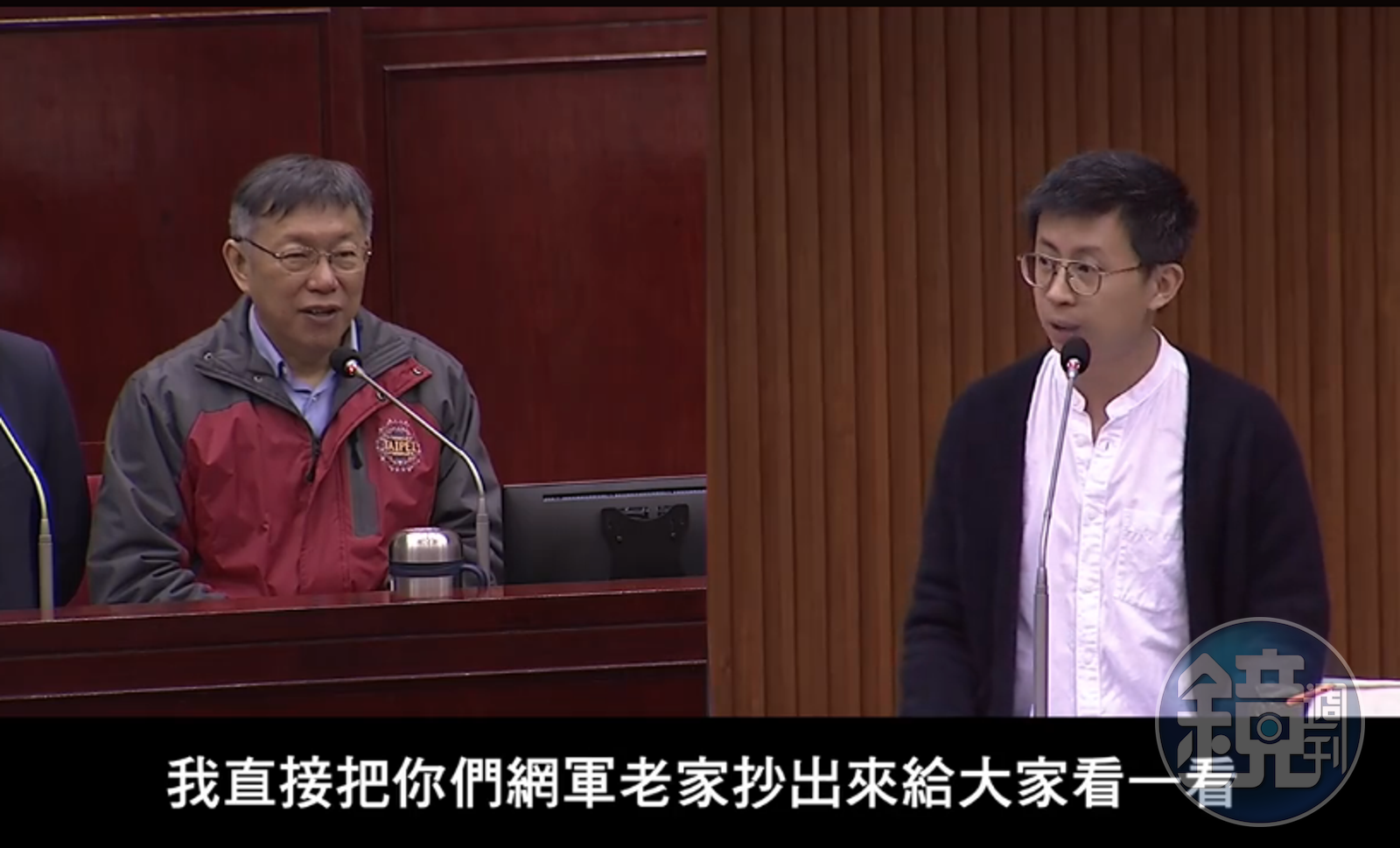 邱威傑反嗆造謠的國民黨議員「如果你們繼續這樣鬧,散播這些假資訊的話,我坦白講,我哪天真的不爽起來,我直接把你們網軍老家抄出來給大家看一看」,柯文哲也表示「好!歡迎!」。