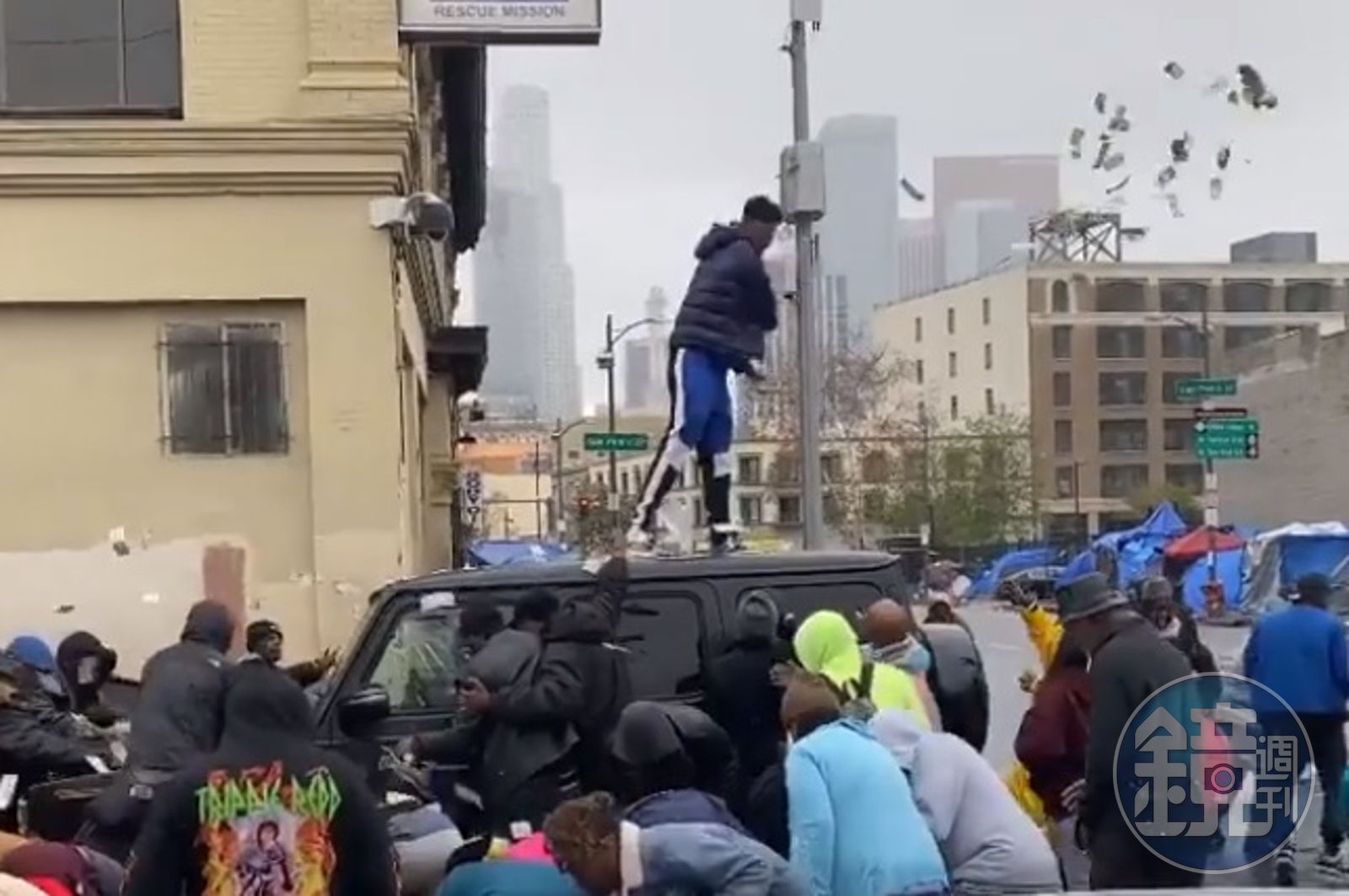 近日Blueface在IG上PO出一段名為「給予的季節」(The season of giving)的影片,他前往洛杉磯一處貧民窟,並爬到路邊的車頂上,接著拿出大把鈔票狂撒。影片中可見路人瞬間聚集撿錢,場面相當混亂,當Blueface不再繼續撒錢,還大喊:「沒了嗎?沒了嗎?」