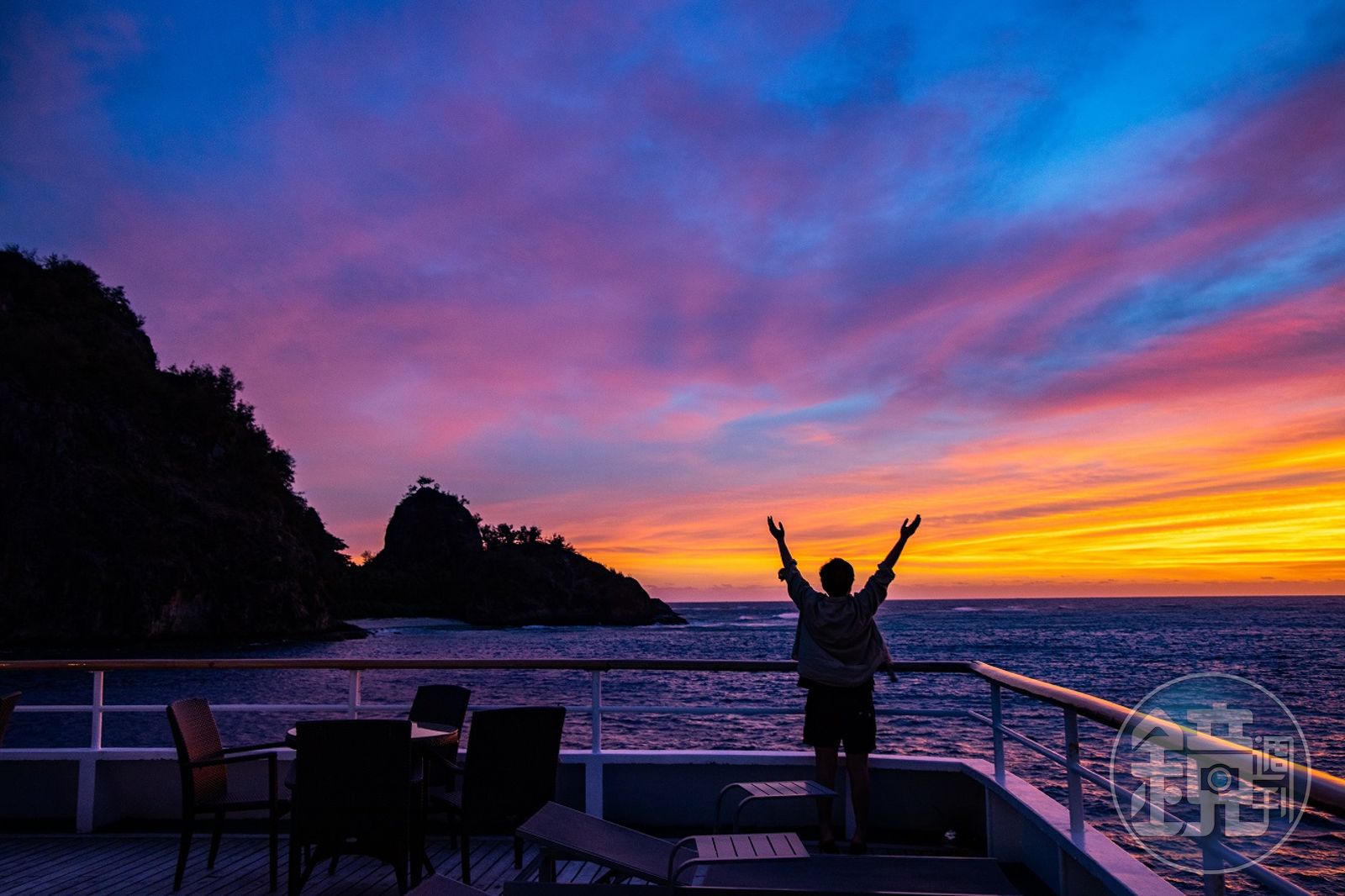 若問我為何選擇郵輪玩斐濟?只因為南太平洋太美,看千萬次也不厭倦,搭船在海上,3天都看到有生以來見過最美的夕陽餘暉,鮮黃色與粉紅色灑滿整座天空,那日晚餐,船長喚了3次,大夥才捨得走入餐廳。