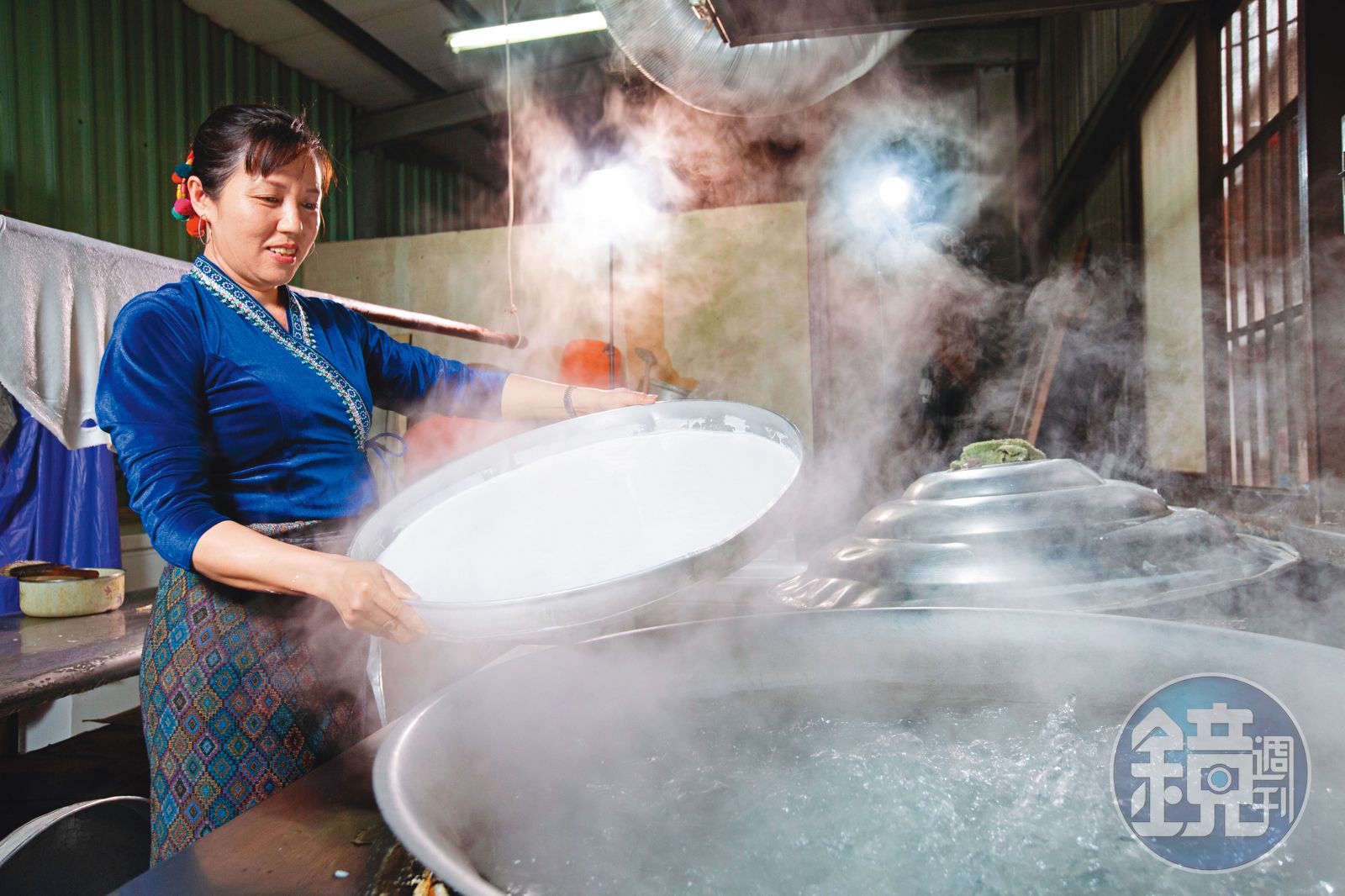 相較於街上的和平悠閒,阿嬌米干的廚房倒有些像戰場。背景音是大鍋裡咕嚕咕嚕的沸騰水聲,穿著寶藍色傳統緬服的謝民嬌,手腳俐落地在直徑約一公尺的大圓盤裡刷上一層薄油,舀入剛磨好的米漿細細搖勻,轉身、掀鍋蓋、拉出蒸熟米干、將另一個大圓盤放入鍋,所有動作一氣呵成。