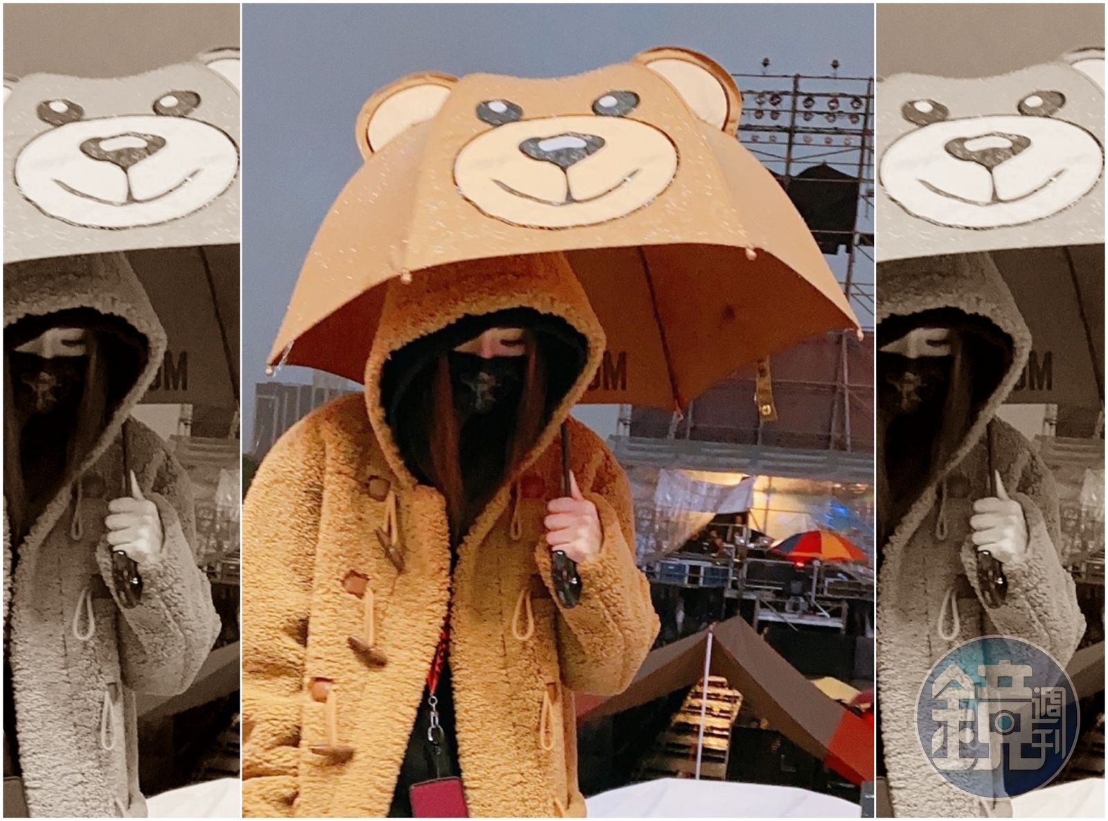 熊熊造型雨傘。NT$4,800(藍鐘提供)謝金燕手上的這把招牌熊熊傘,根本就像是隻活生生的泰迪熊在趴趴走,完全是把令人走在路上可以回頭率100%的小物啊!這隻超大可愛熊臉的傘,為了更有效地防止被雨水潑到,傘面特意做得比一般雨傘窄,是精品的用心,也凸顯做工精緻的細節之處。