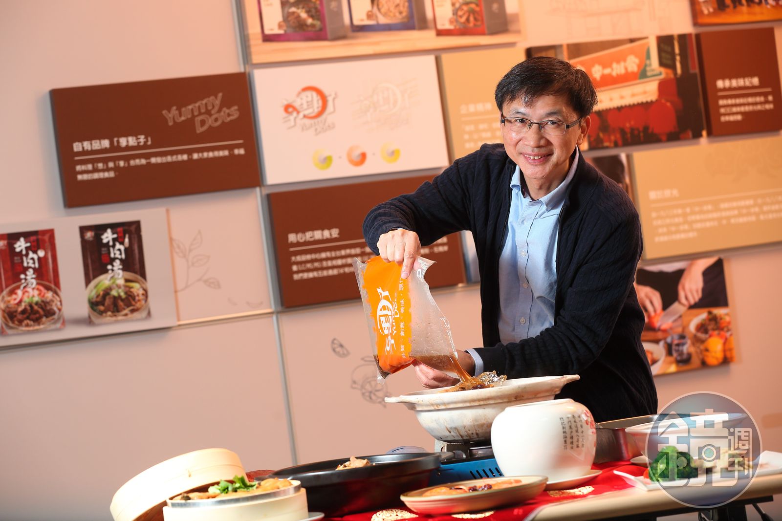 「欣光的資料庫裡有千種產品,平均每月生產300種品項,能依顧客通路屬性與成本,2天內客製化開發樣品。」以往中餐難複製的最大障礙在於各家用料、調味路數不同,遑論煎煮炒炸繁瑣流程,電腦工程師出身的詹金和,做生意講求精準與效率,「我要求客戶的研發直接對公司研發,先把口味、固形物重量尺寸確定,再由採購去談價錢,沒辦法配合,我們就不要合作。」