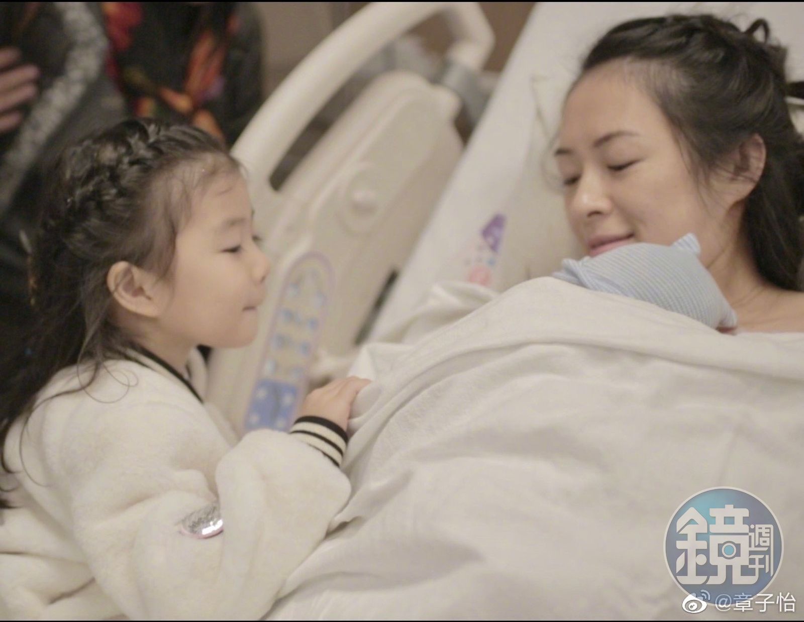 圖片中可以看到汪峰抱著兒子,女兒醒醒在一旁相當好奇注視著這剛出生的弟弟,輕握弟弟的小手、輕撫弟弟的笑臉,模樣相當可愛,也相當有大姊姊的姿態。