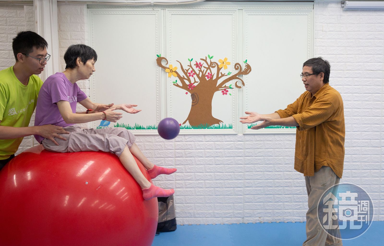 在會館協助病友復健的職能治療師鄭憲鵬表示:「失智症不可逆,一般來說,10到15年就會退化到沒有行為能力,年輕型的可能更快。」我們參與了其中一堂中重度患者的知覺統合課程,發現被一般人視為暖身的活動,已是主要訓練,簡單的丟接球,對他們來說都像不可能的任務。