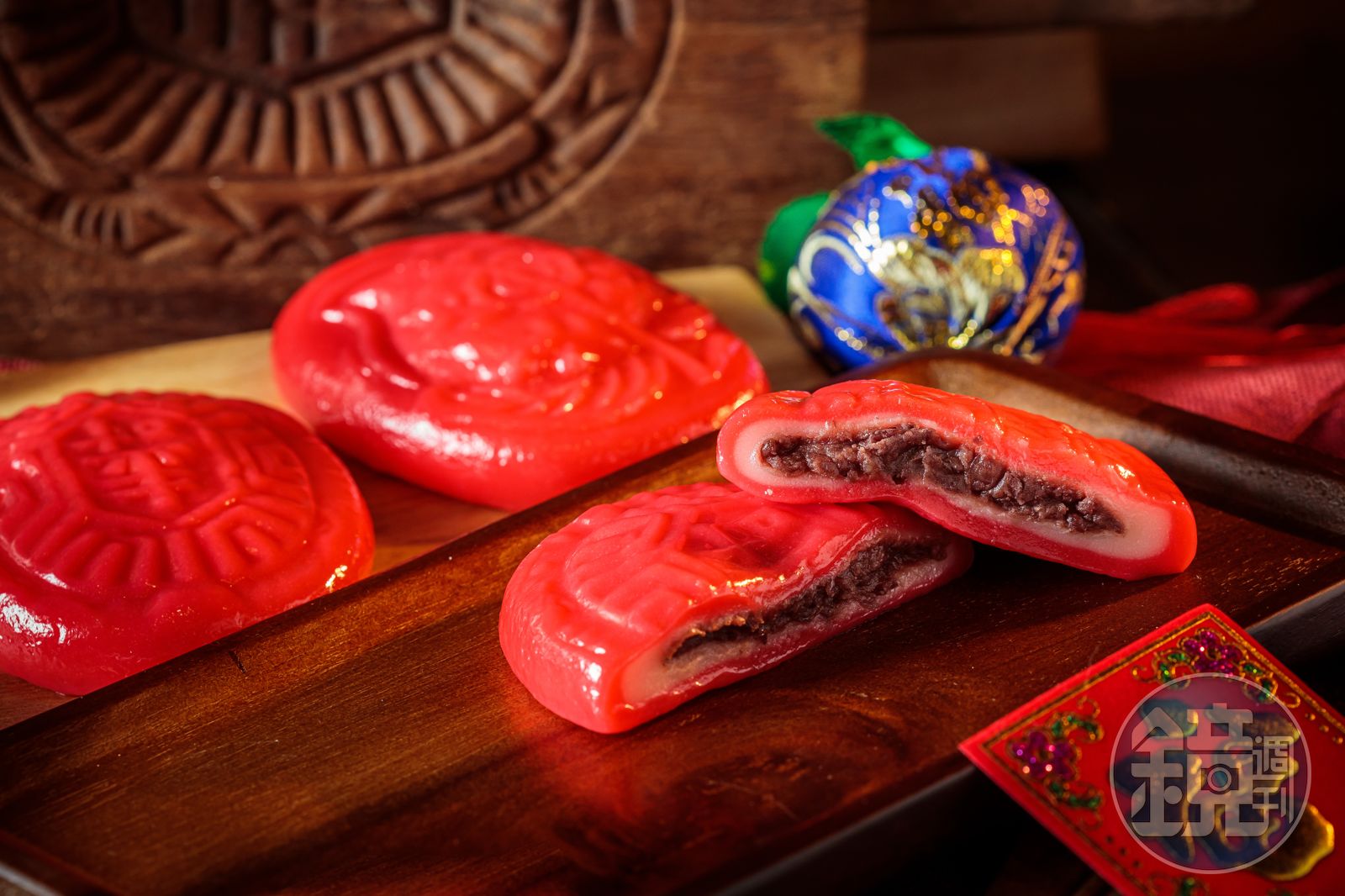 紅龜粿之所以成為招牌,是因為相當講究食材和工序,特別選用放置一年的圓糯米,水分減少,吃起來才有黏性和Q度,最大不同是店家用紅色包著白色米糰,再掐進紅豆餡,象徵金包銀的吉利意思。